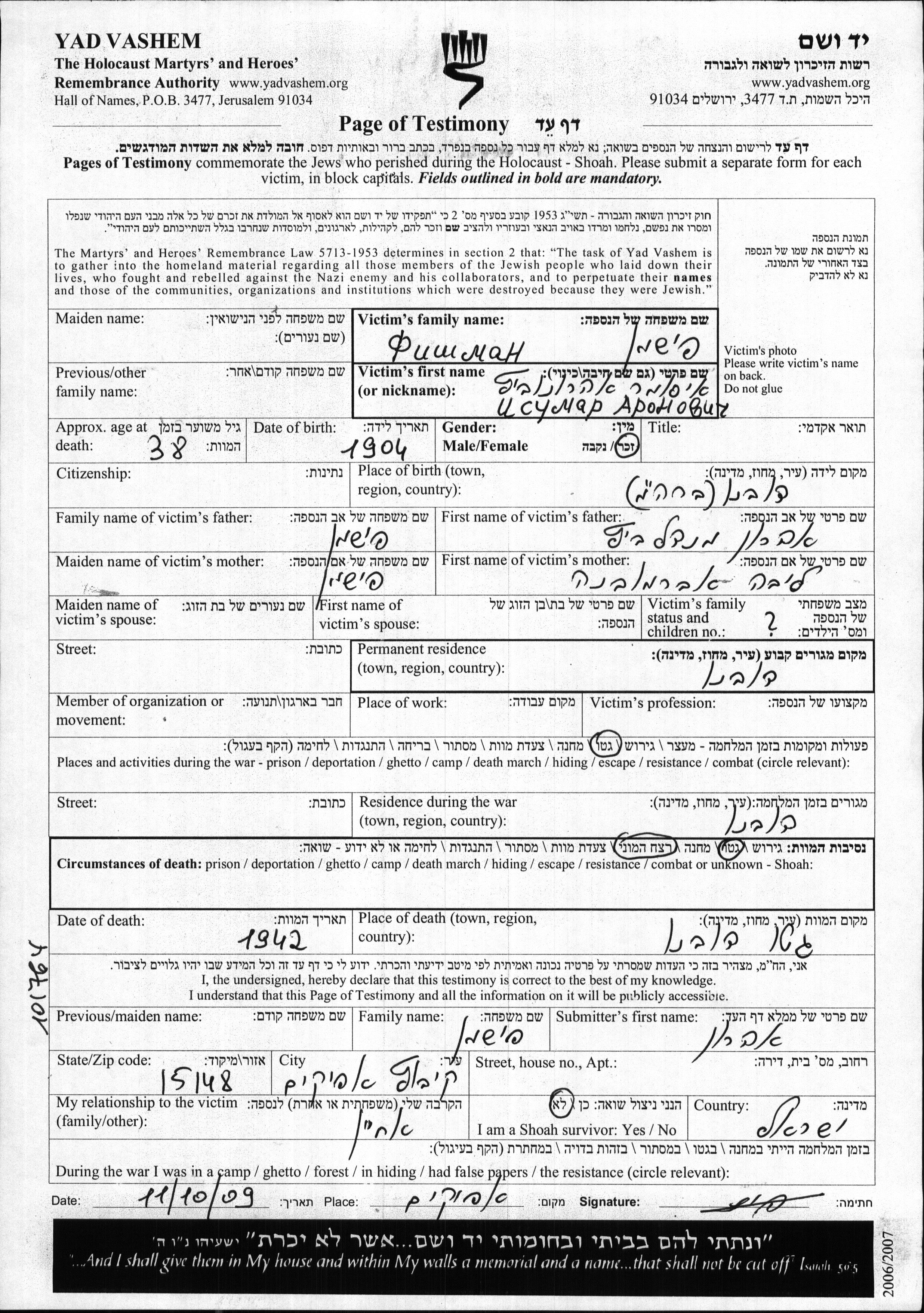 Isumar wurde in der Schoah ermordet. Todesort: Dubno, Polen im Jahr 1942.
