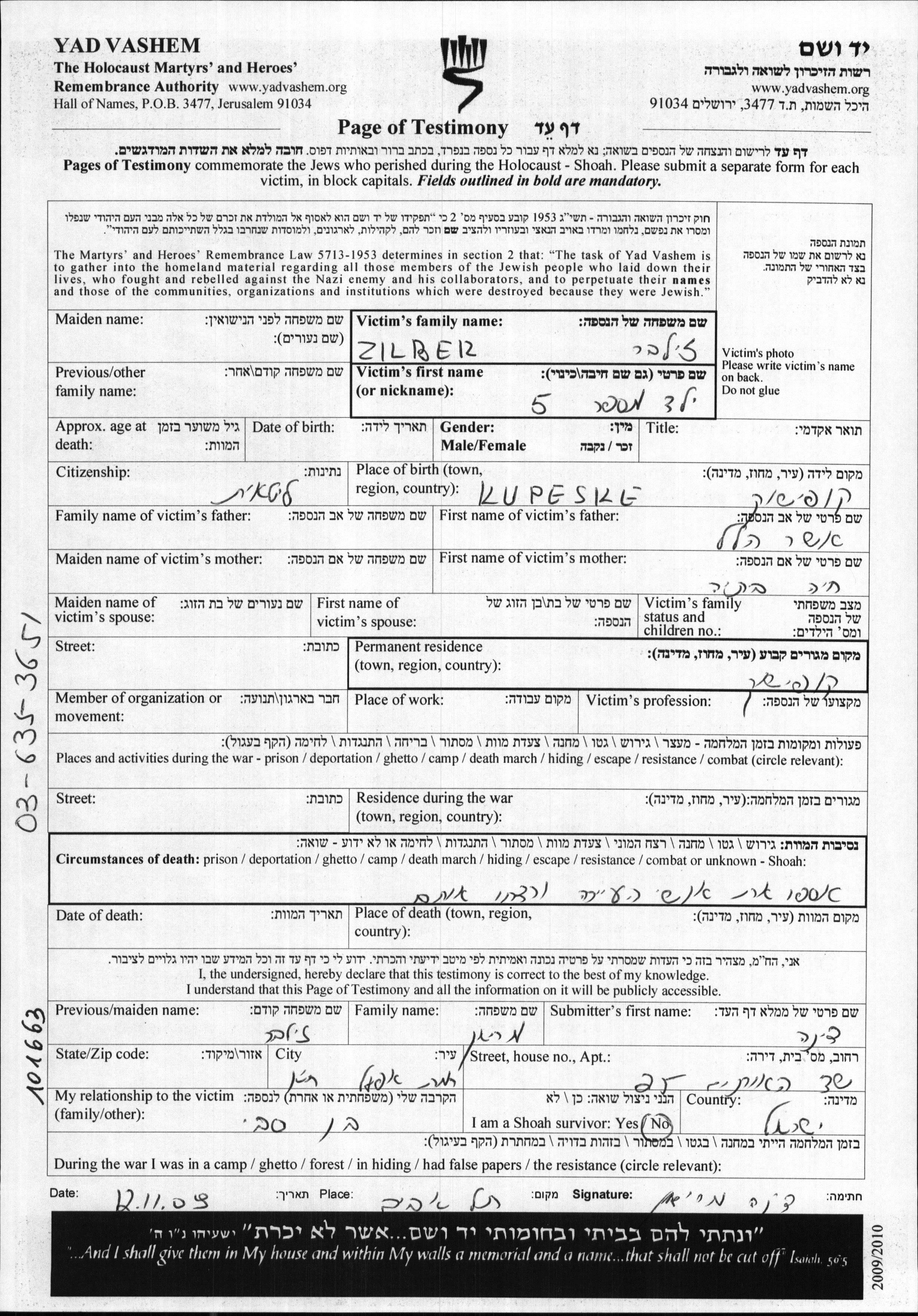 Vorname unbekannt Zilber wurde in Kupishki, Litauen geboren. Er/sie war der/ die Sohn/Tochter von Asher Hilel und Chaia Batia. Er/Sie war Kind. Vor dem Zweiten Weltkrieg er/sie in Kupishki, Litauen. Während des Krieges war er/sie in Kupishki, Litauen.