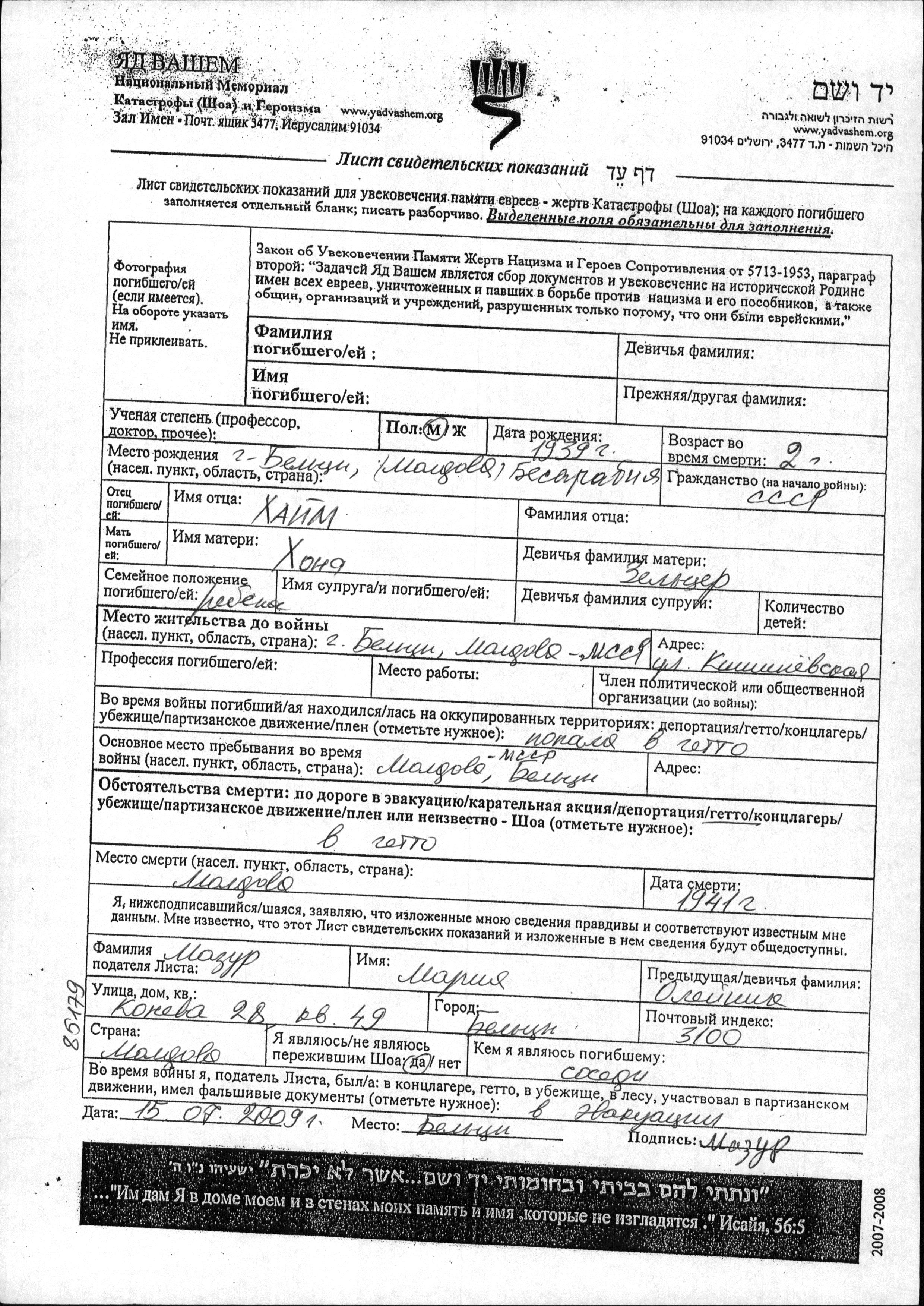 Vorname unbekannt Name unbekannt wurde im Jahr 1939 in Balti, Rumänien geboren. Er war der Sohn von Khaym und Khona, geb. Zeltzer. Er war Kind. Vor dem Zweiten Weltkrieg lebte er in Balti, Rumänien. Während des Krieges war er in Getto.