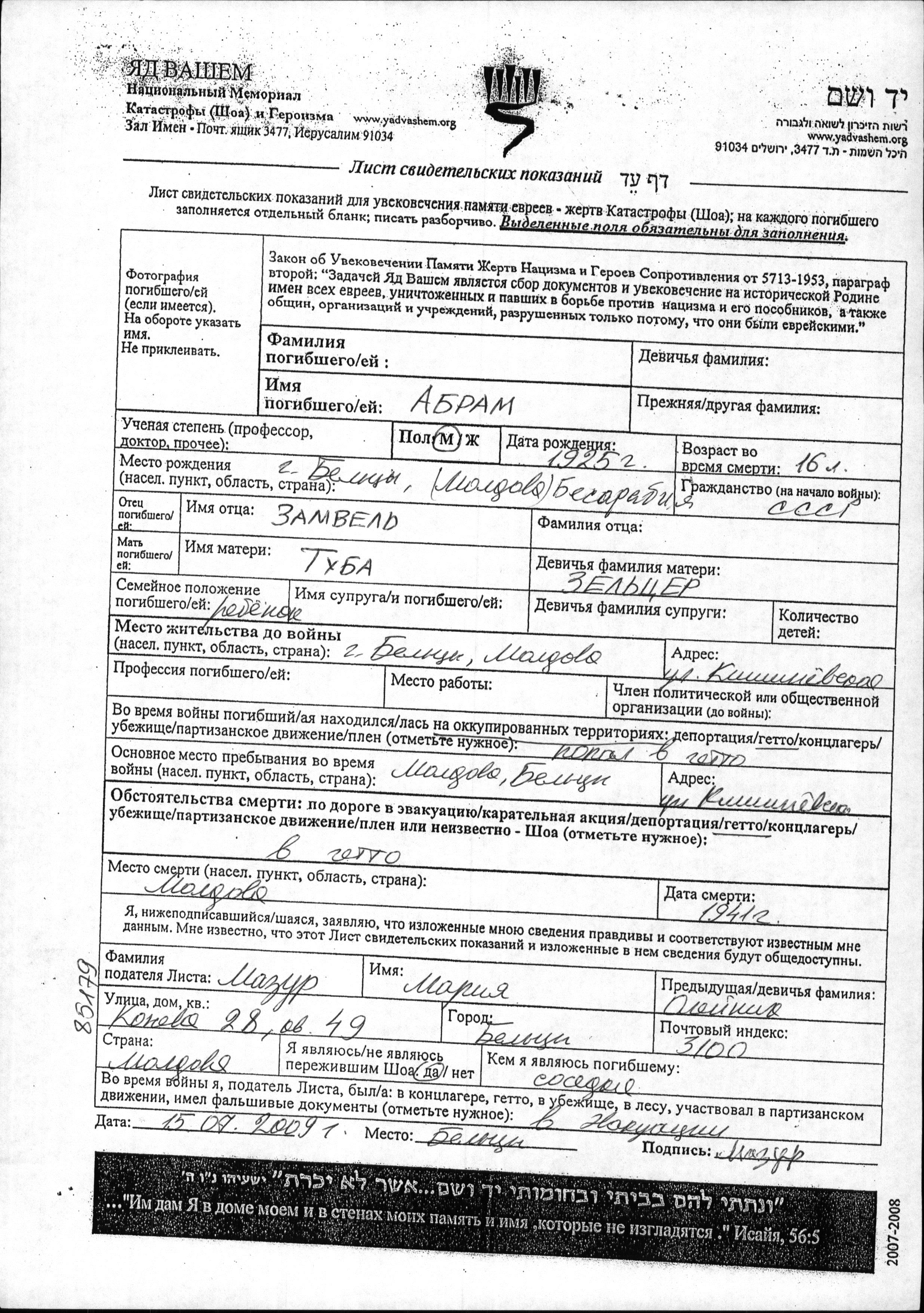 Abram wurde in der Schoah ermordet. Todesort: Bessarabia, Moldau im Jahr 1941.