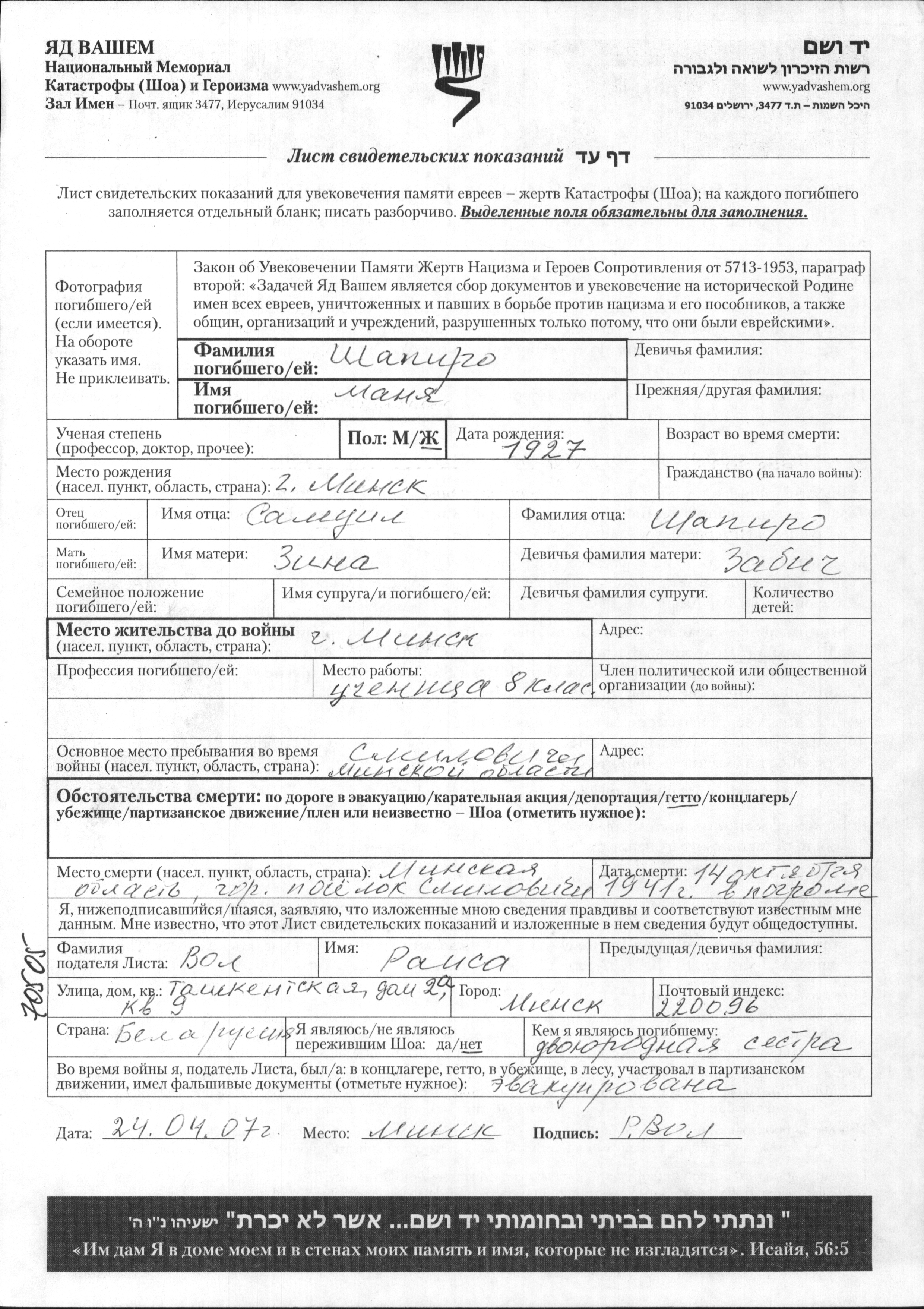 Manya Shapiro wurde im Jahr 1927 in Minsk, Weißrussland (UdSSR) geboren. Sie war die Tochter von Samuil und Zina, geb. Zabich. Sie war Schüler/-in und Jugendliche/-r. Vor dem Zweiten Weltkrieg lebte sie in Minsk, Weißrussland (UdSSR). Während des Krieges war sie in Smilovichi, Weißrussland (UdSSR).