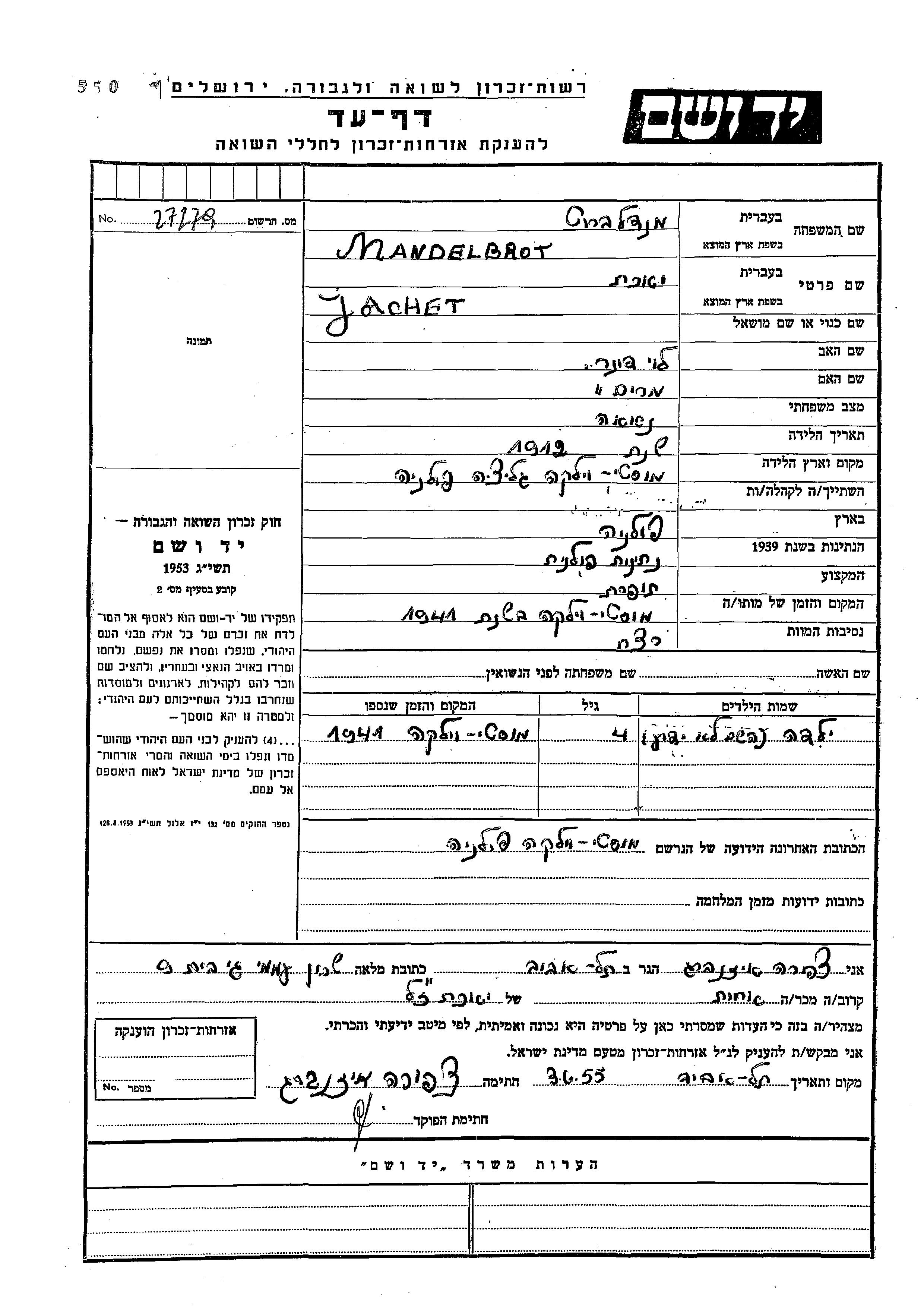 Jachet Mandelbrot, geb. Diner wurde im Jahr 1912 in Mosty Wielkie, Polen geboren. Sie war die Tochter von Levi und Miriam. Sie war Schneiderin und Verheiratet. Vor dem Zweiten Weltkrieg lebte sie in Mosty Wielkie, Polen. Während des Krieges war sie in Mosty Wielkie, Polen.