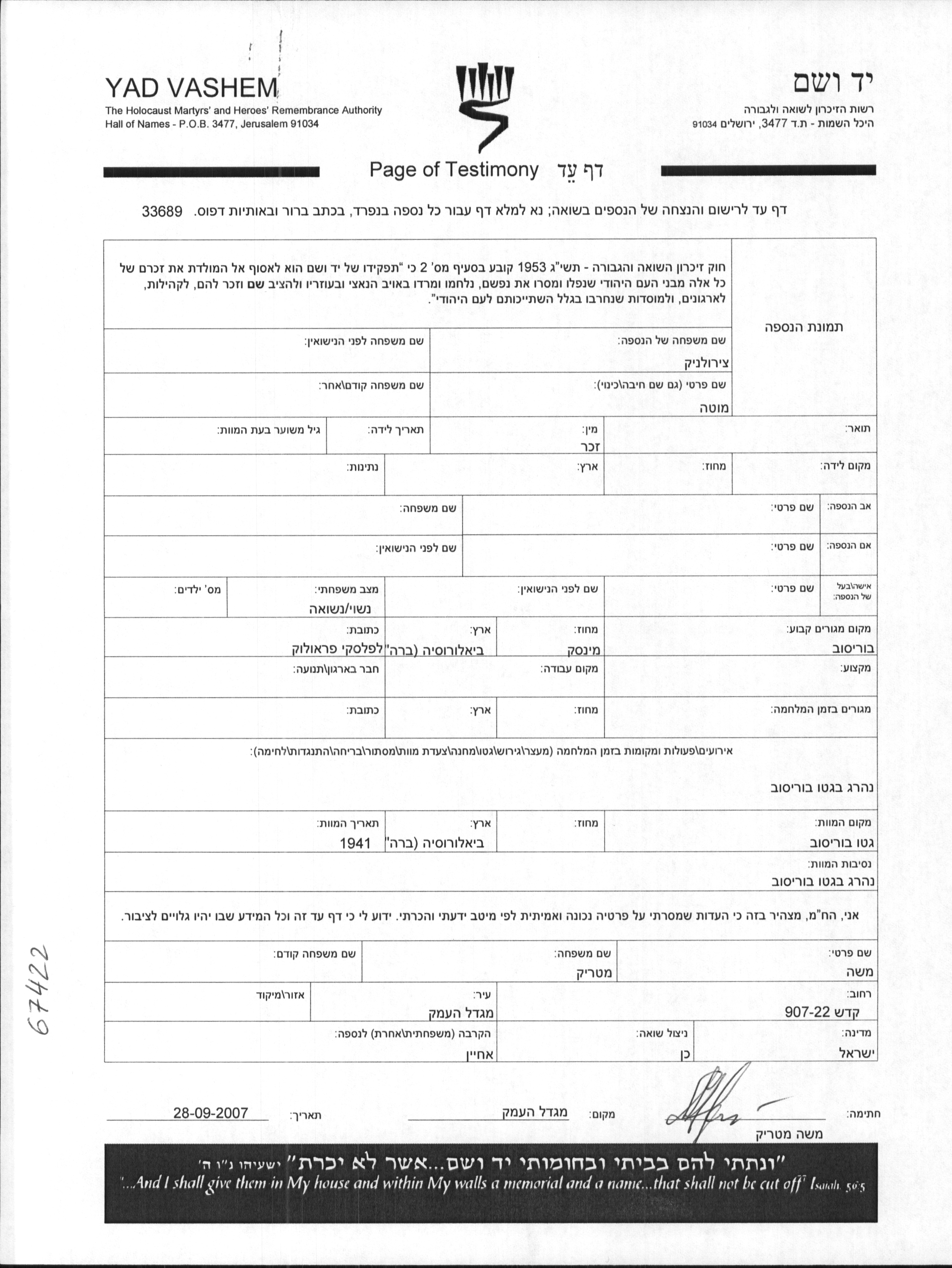 Mota Tzirulnik. Er war Verheiratet. Vor dem Zweiten Weltkrieg lebte er in Borisov, Weißrussland (UdSSR). Während des Krieges war er in Borisov, Weißrussland (UdSSR).