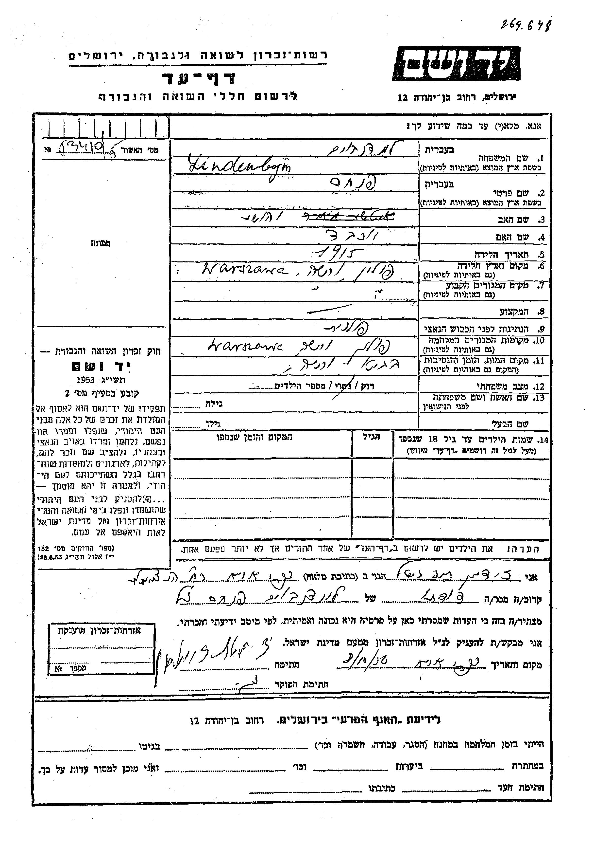 Pinkhas Lindenbojm wurde im Jahr 1915 in Varsha, Polen geboren. Er war der Sohn von Yehoshua und Yokheved. Er war Ledig. Vor dem Zweiten Weltkrieg lebte er in Warszawa, Polen. Während des Krieges war er in Varsha, Polen.