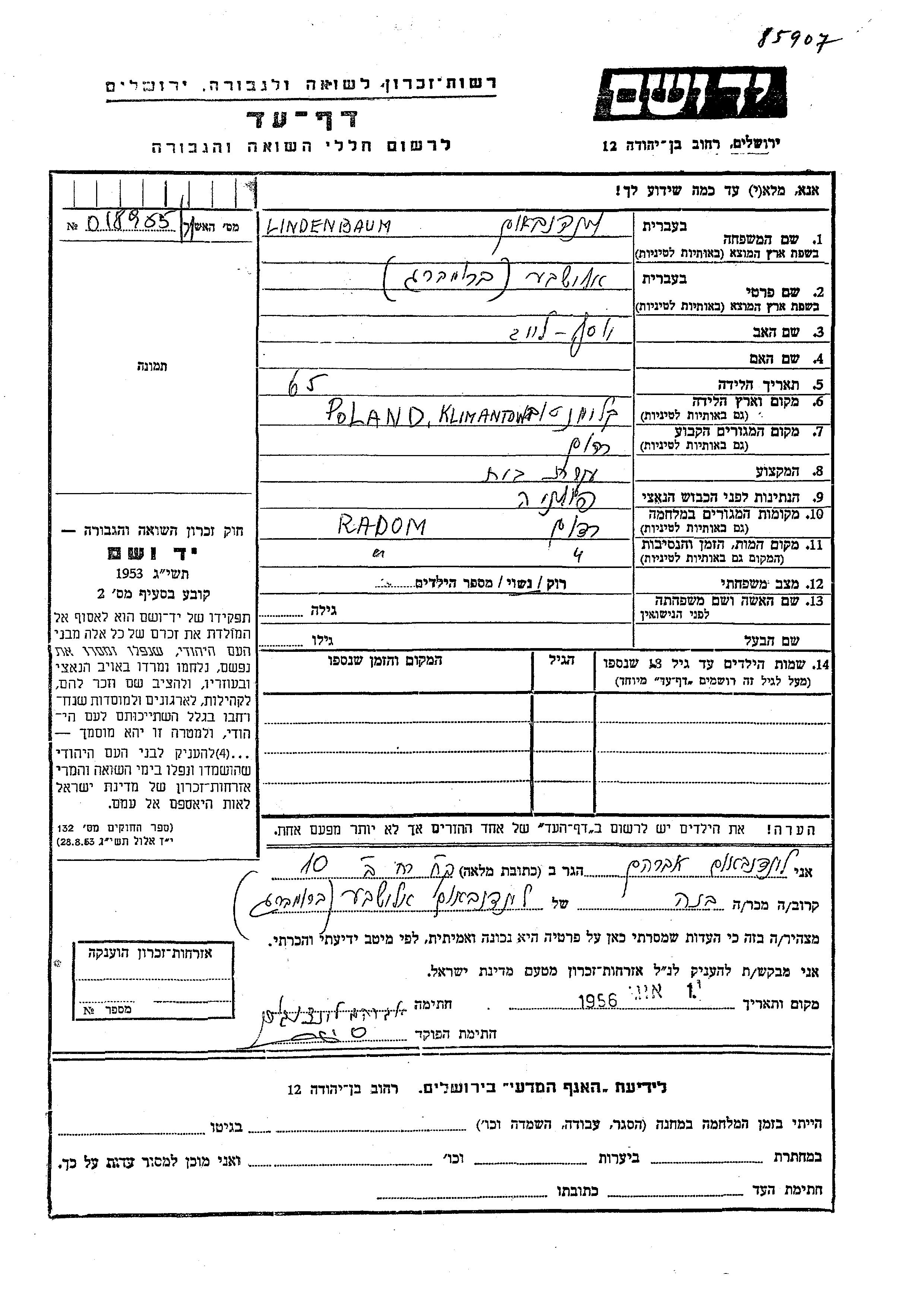 Elisheva Lindenbaum, geb. Bromberg wurde in Klimontow, Polen geboren. Sie war die Tochter von Yosef Leib. Sie war Hausfrau und Verheiratet. Vor dem Zweiten Weltkrieg lebte sie in Radom, Polen. Während des Krieges war sie in Radom, Polen.