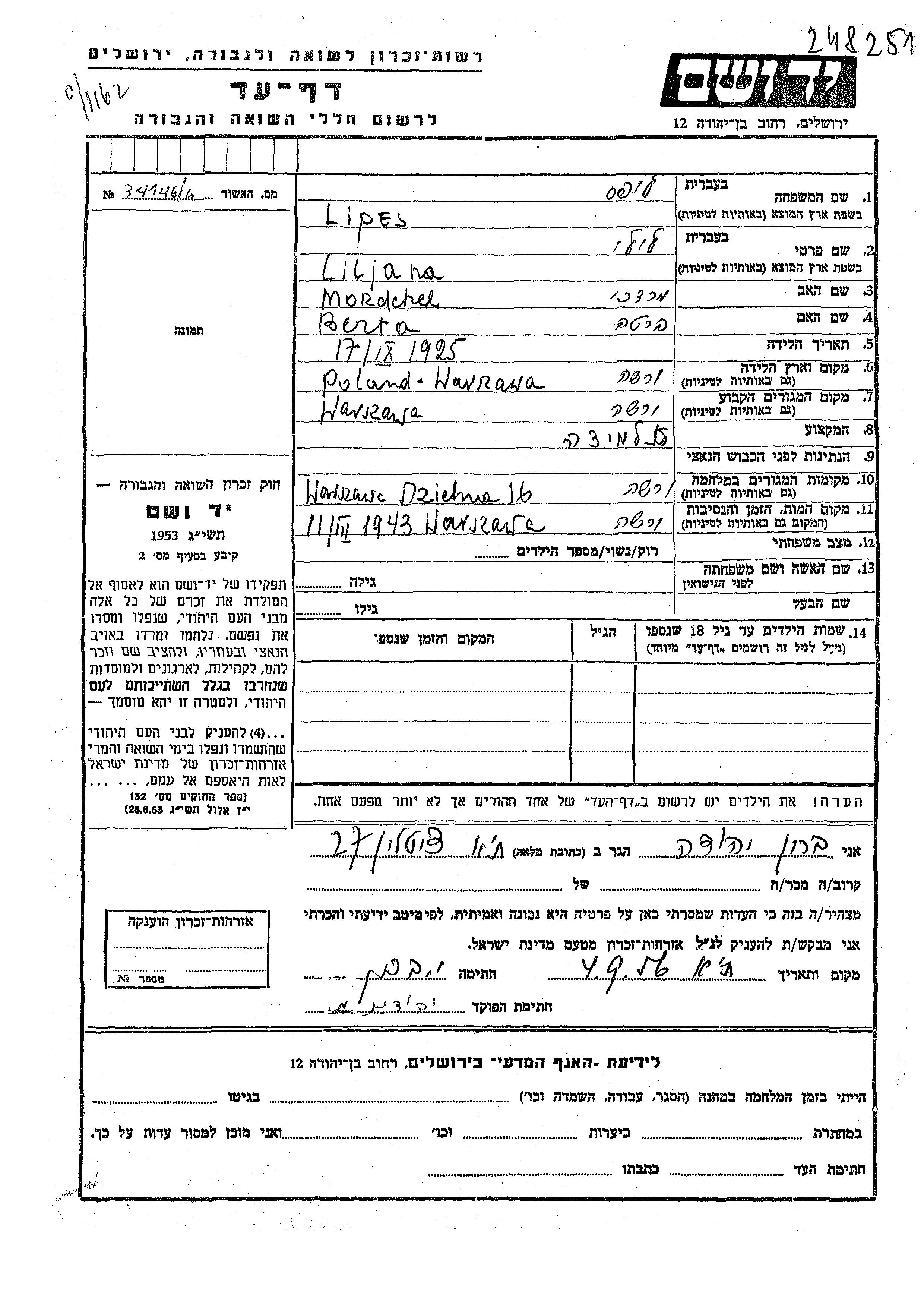 Liljana Lipes wurde im Jahr 1925 in Varsha, Polen geboren. Sie war die Tochter von Mordchei und Berta. Sie war Schüler/-in. Vor dem Zweiten Weltkrieg lebte sie in Varsha, Polen. Während des Krieges war sie in Varsha, Polen.