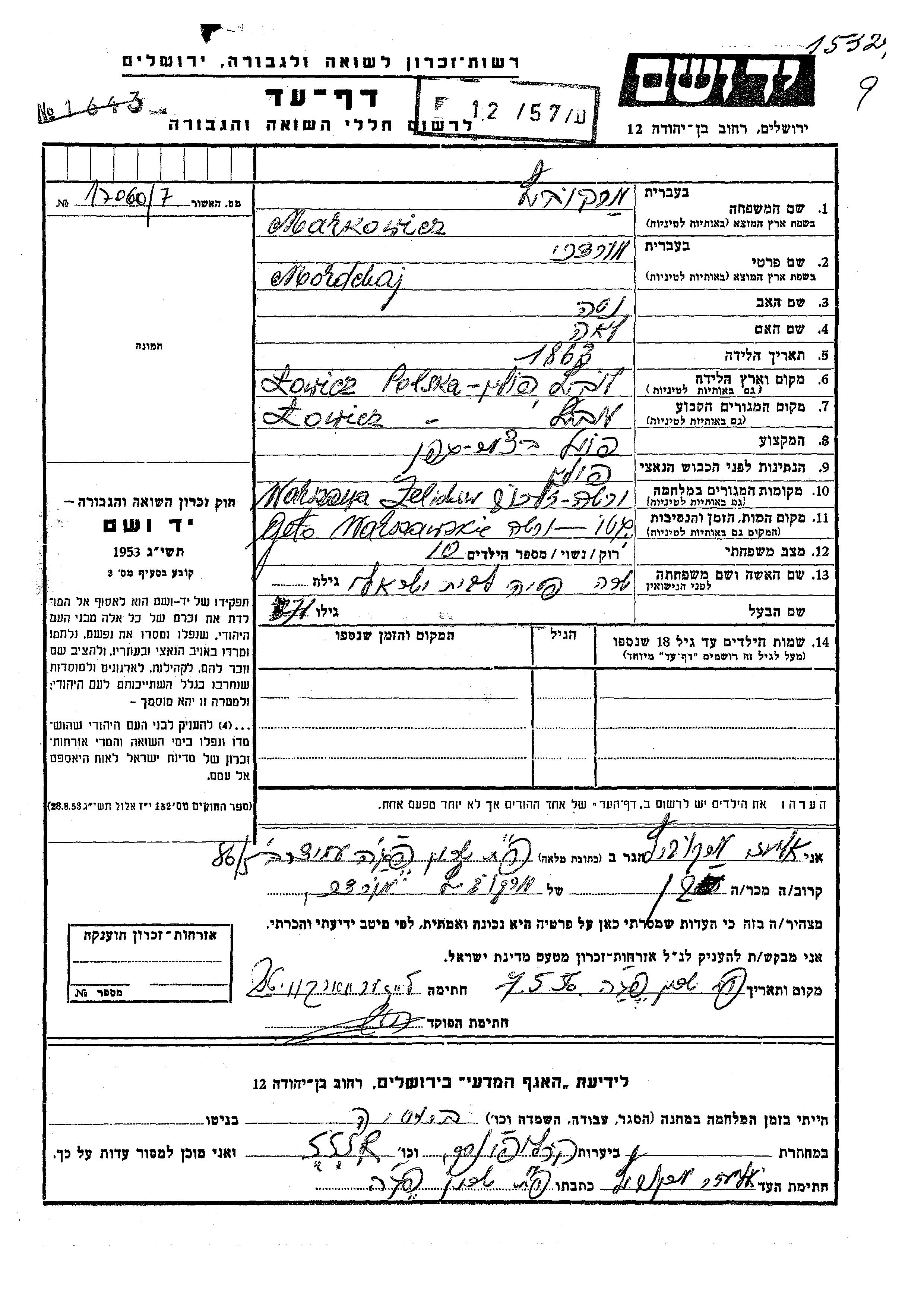 Mordehaj Markowicz wurde im Jahr 1863 in Lowicz, Polen geboren. Er war der Sohn von Neta und Lea. Er war פועל צמר גפן. Vor dem Zweiten Weltkrieg lebte er in Lowicz, Polen. Während des Krieges war er in Zelichow, Polen.