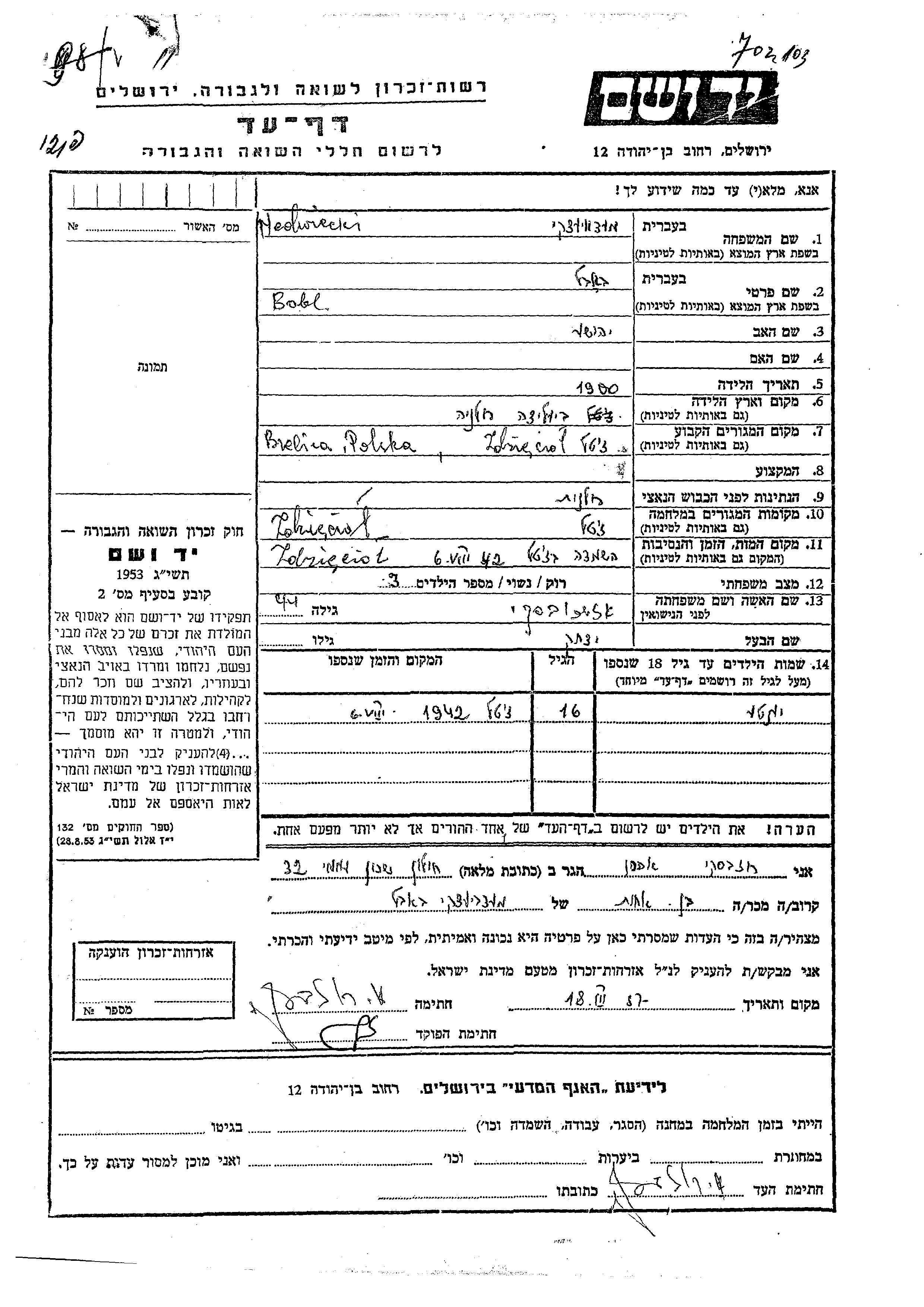 Iente Medwiecki wurde Sie war die Tochter von Yitzkhak und Bobl Bela, geb. Ozhekhovski. Sie war Kind. Vor dem Zweiten Weltkrieg lebte sie in Bielica, Polen. Während des Krieges war sie in Zdzieciol, Polen.