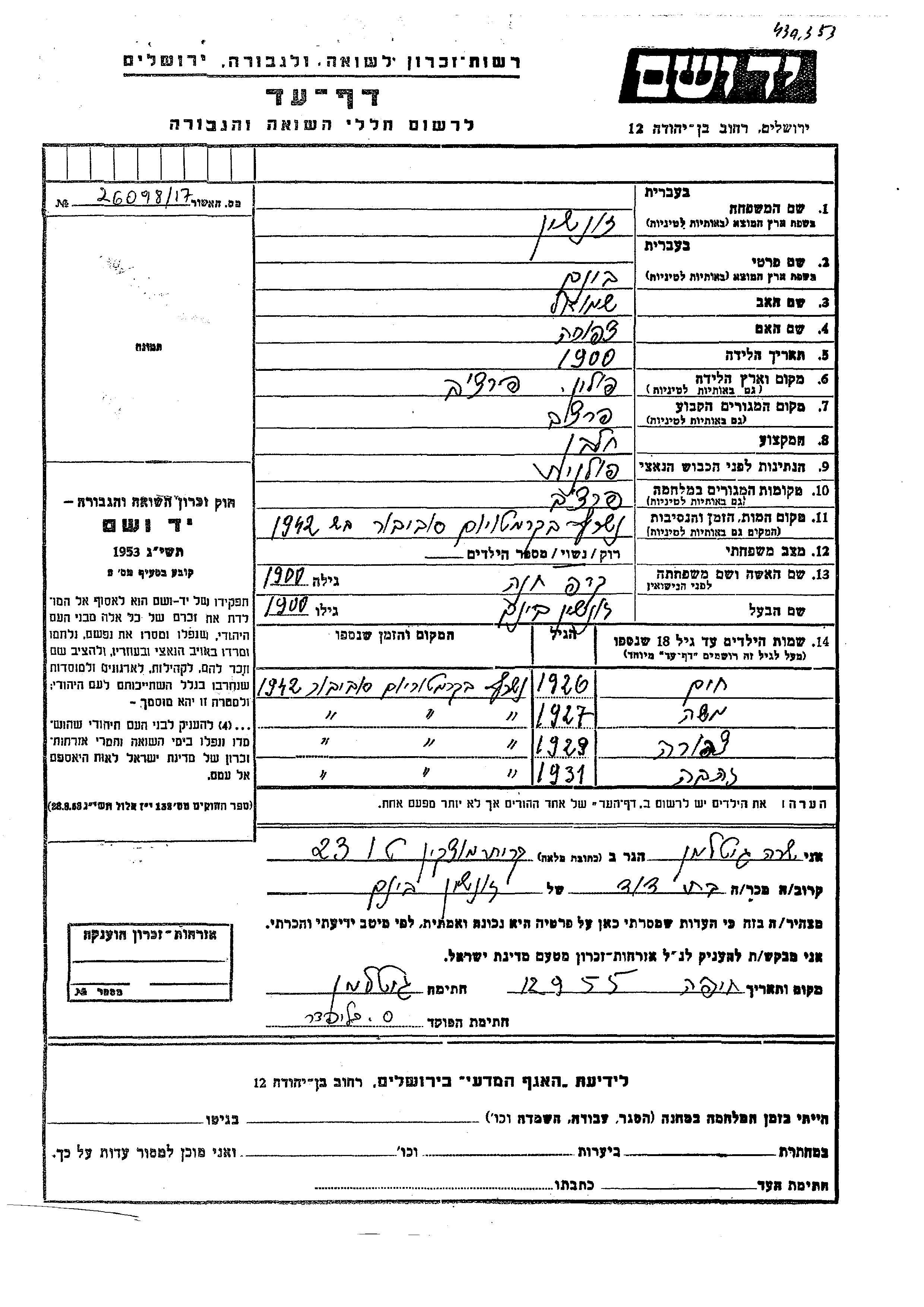 Zonshein Khaim 1926 Parczew, Polen Gedenkblatt