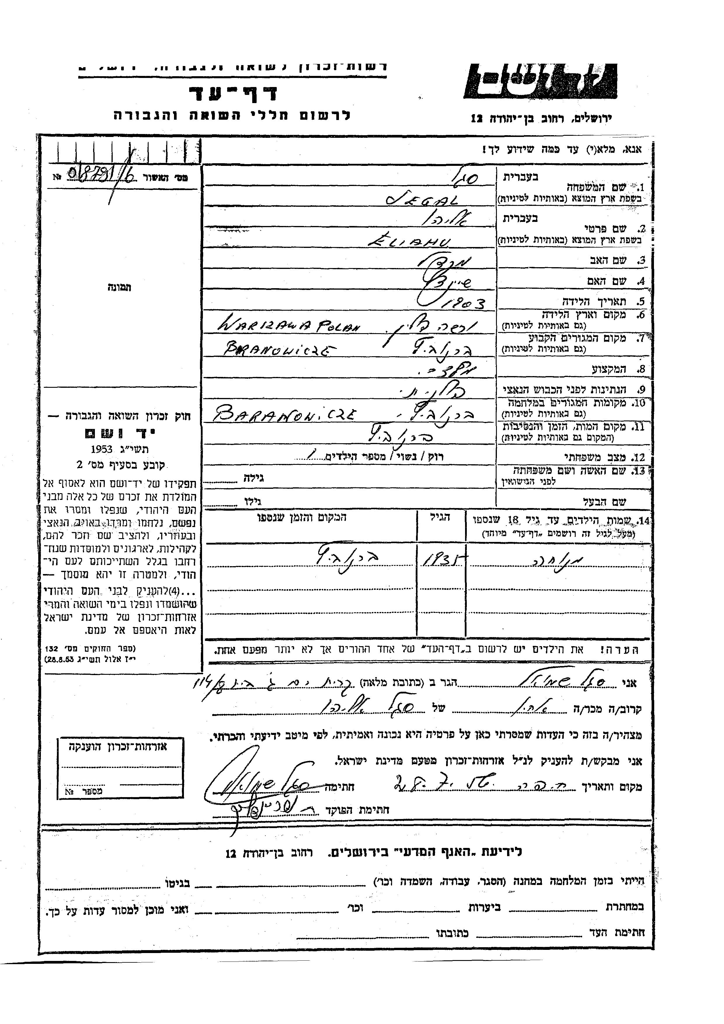 Segal Menukha 1935 Baranowicze, Polen Gedenkblatt