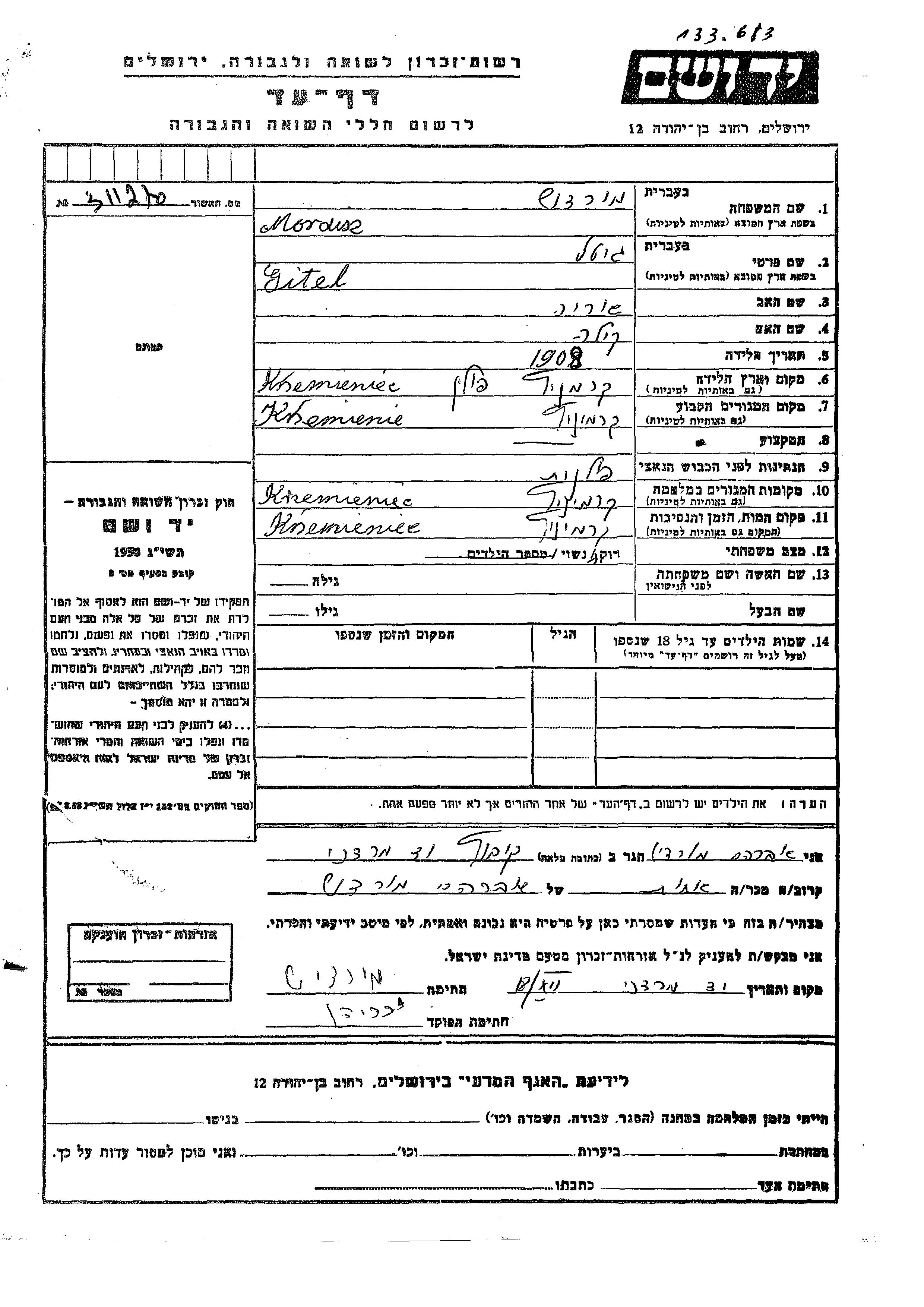 Gitel Mordisz wurde im Jahr 1908 in Krzemieniec, Polen geboren. Sie war die Tochter von Arie und Keila. Sie war Ledig. Vor dem Zweiten Weltkrieg lebte sie in Krzemieniec, Polen. Während des Krieges war sie in Krzemieniec, Polen.