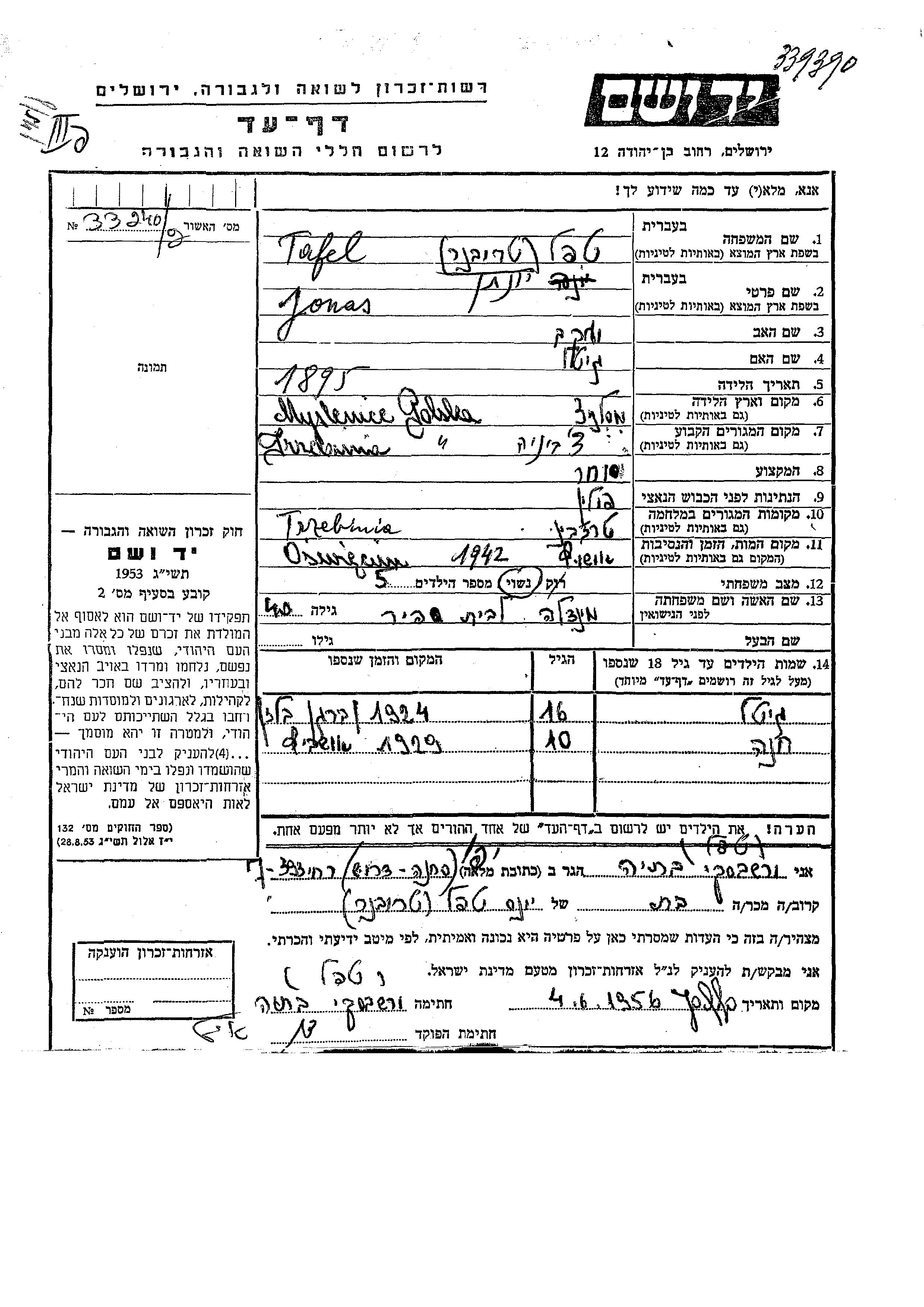 Khana Tafel Tepel Traubner wurde im Jahr 1929 geboren. Sie war die Tochter von Jonas Yonatan und Mindla, geb. Safir. Sie war Kind. Vor dem Zweiten Weltkrieg lebte sie in Trzebinia, Polen. Während des Krieges war sie in Trzebinia, Polen.