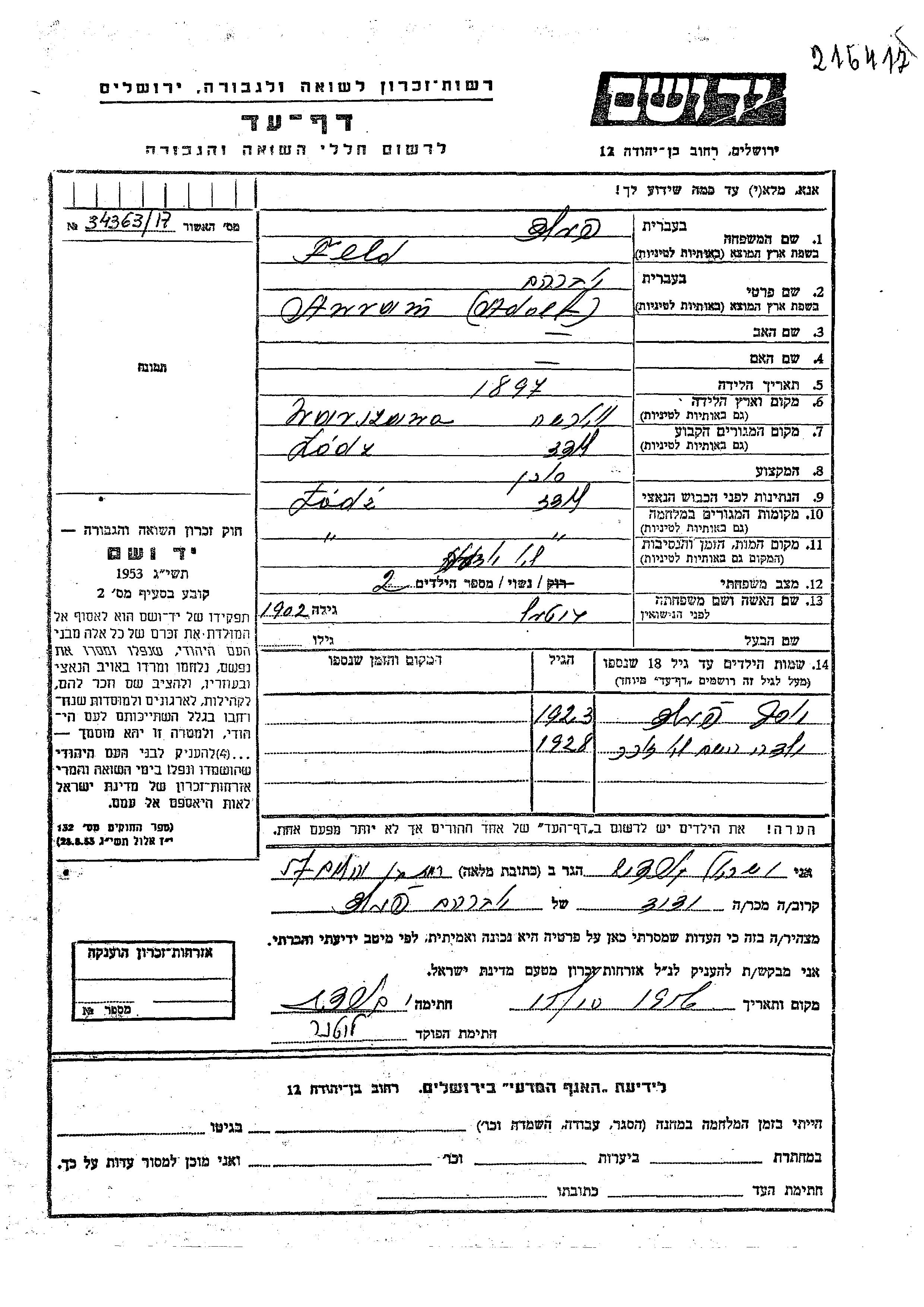 Vorname unbekannt Feld wurde im Jahr 1928 geboren. Er/sie war der/ die Sohn/Tochter von Awram Adolf und Gitel. Er/Sie war Kind. Vor dem Zweiten Weltkrieg er/sie in Lodz, Polen. Während des Krieges war er/sie in Lodz, Polen.