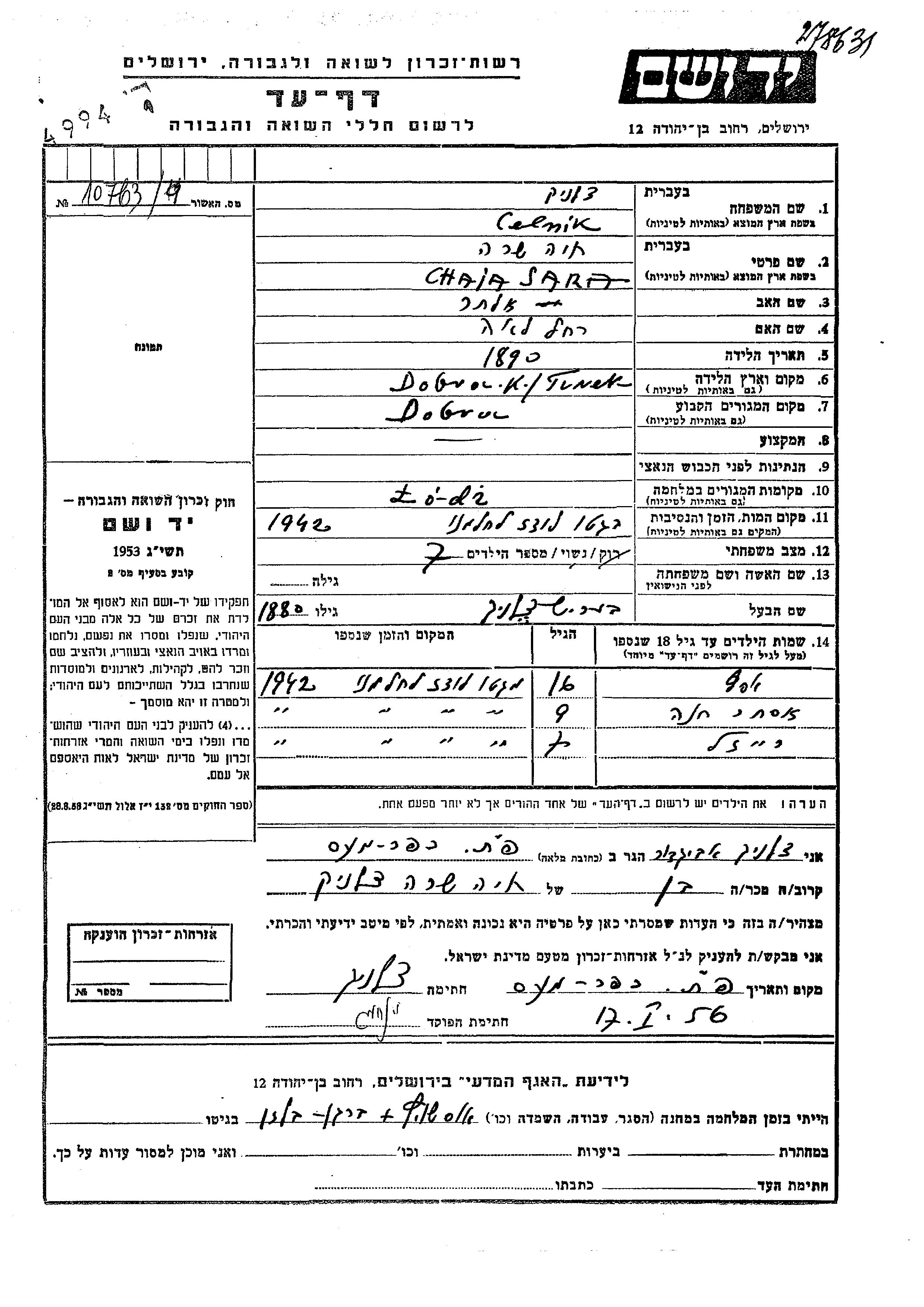 Asaf Celnik wurde Er war der Sohn von Berish und Chaia Sara. Er war Kind. Vor dem Zweiten Weltkrieg lebte er in Dobra, Polen. Während des Krieges war er in Lodz, Polen.