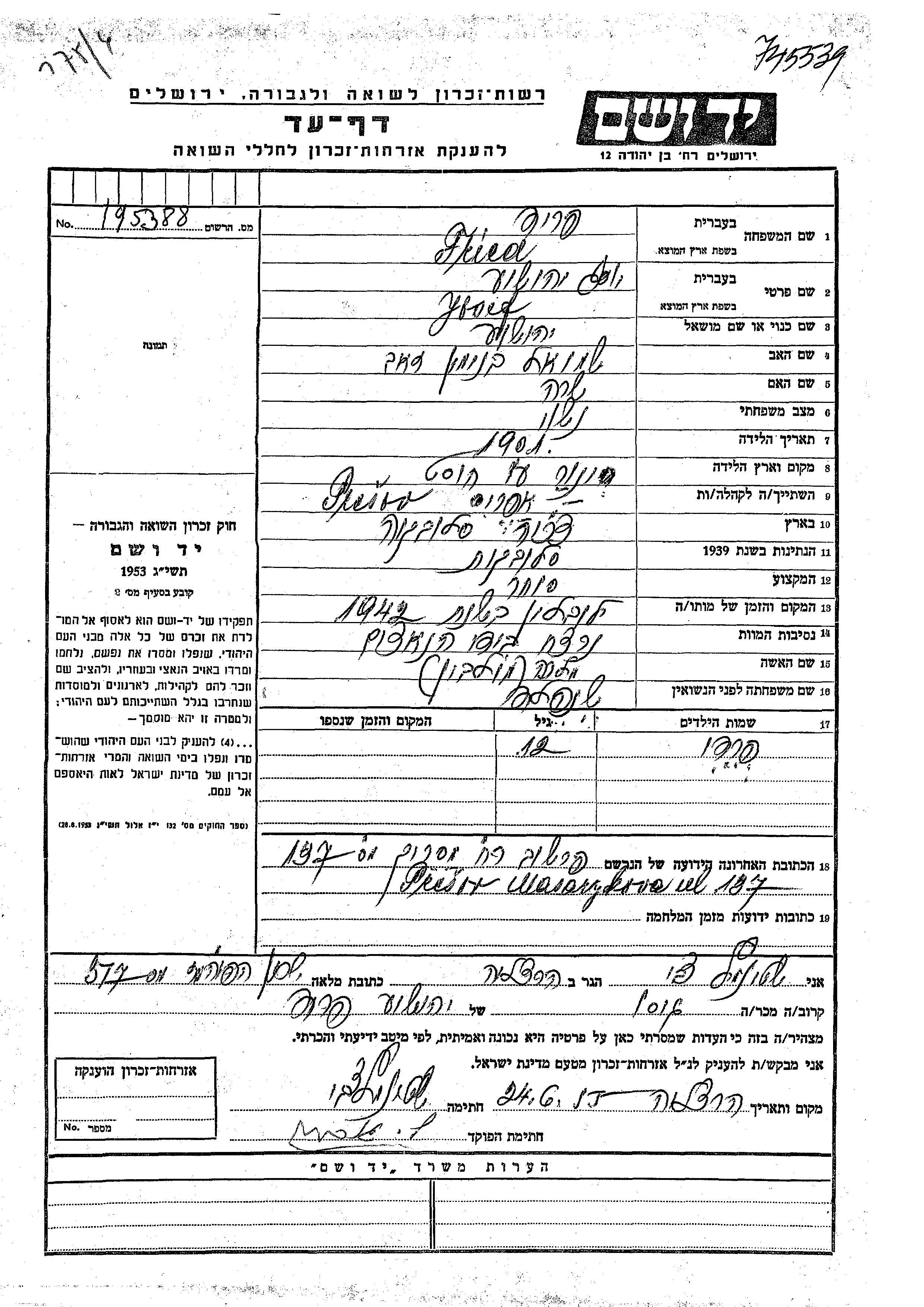Fredi Fried wurde Er/sie war der/ die Sohn/Tochter von Josef Yehoshua und Malka, geb. Sheinfeld. Er/Sie war Kind. Vor dem Zweiten Weltkrieg er/sie in Tschechoslowakei. Während des Krieges war er/sie in Presov, Tschechoslowakei.