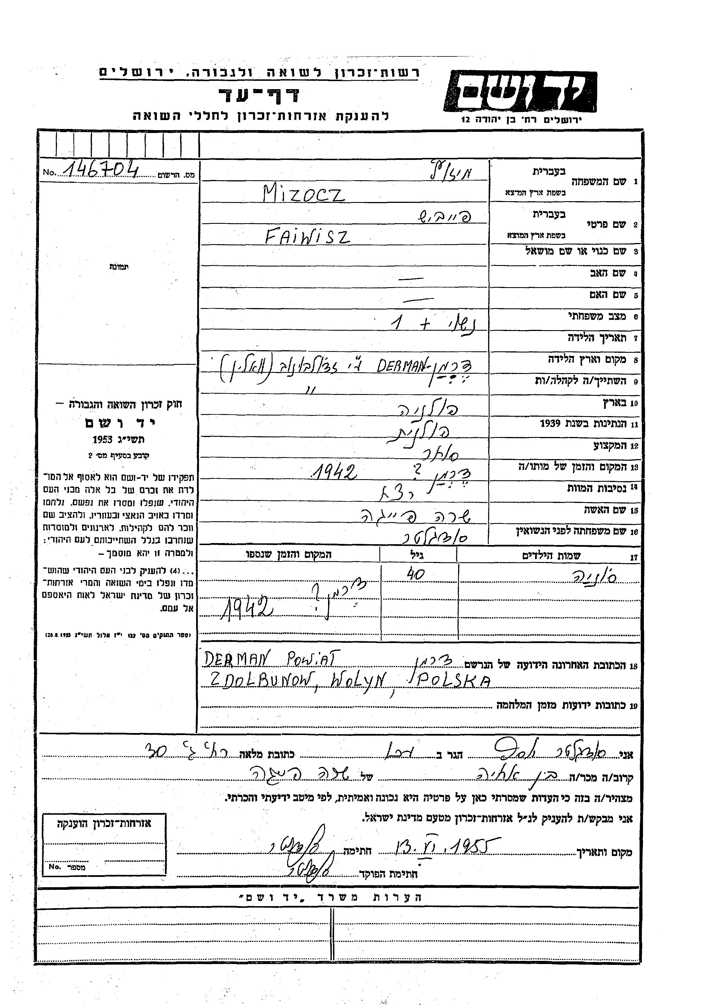 Faiwisz wurde in der Schoah ermordet. Todesort: Derman, Polen im Jahr 1942.