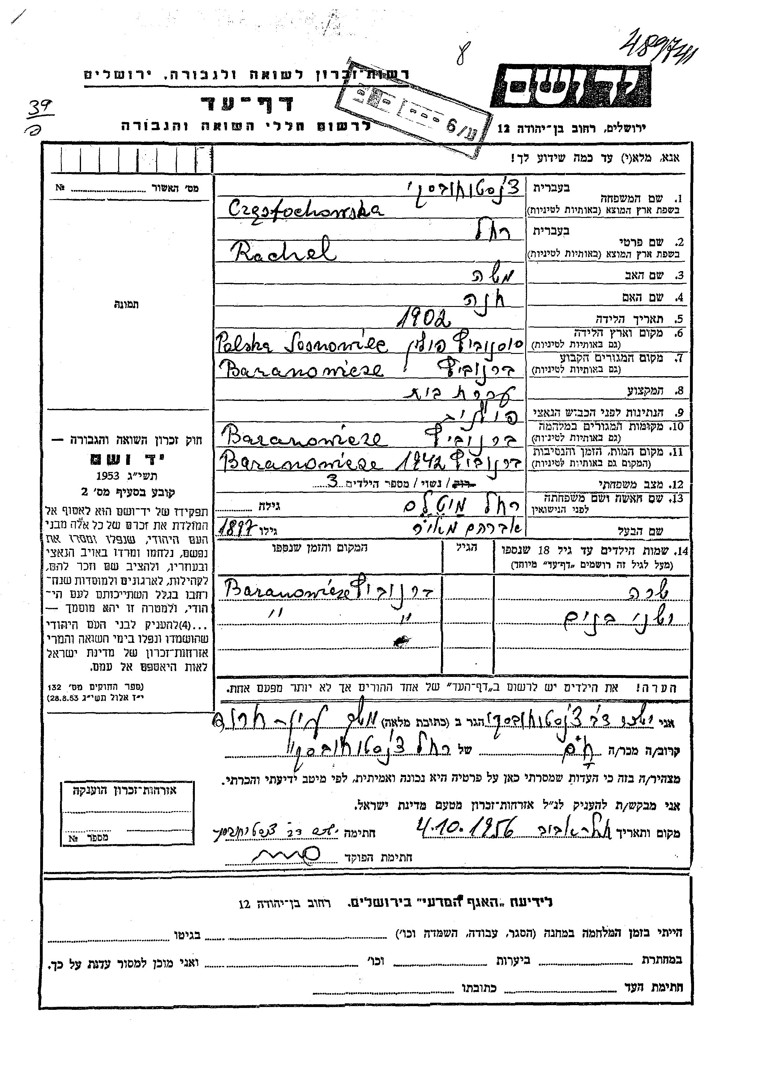 H Czenstochowska wurde Er/sie war der/ die Sohn/Tochter von Avraham Meir und Rachel, geb. Meitlis. Er/Sie war Kind. Vor dem Zweiten Weltkrieg er/sie in Baranovich, Polen. Während des Krieges war er/sie in Baranovich, Polen.