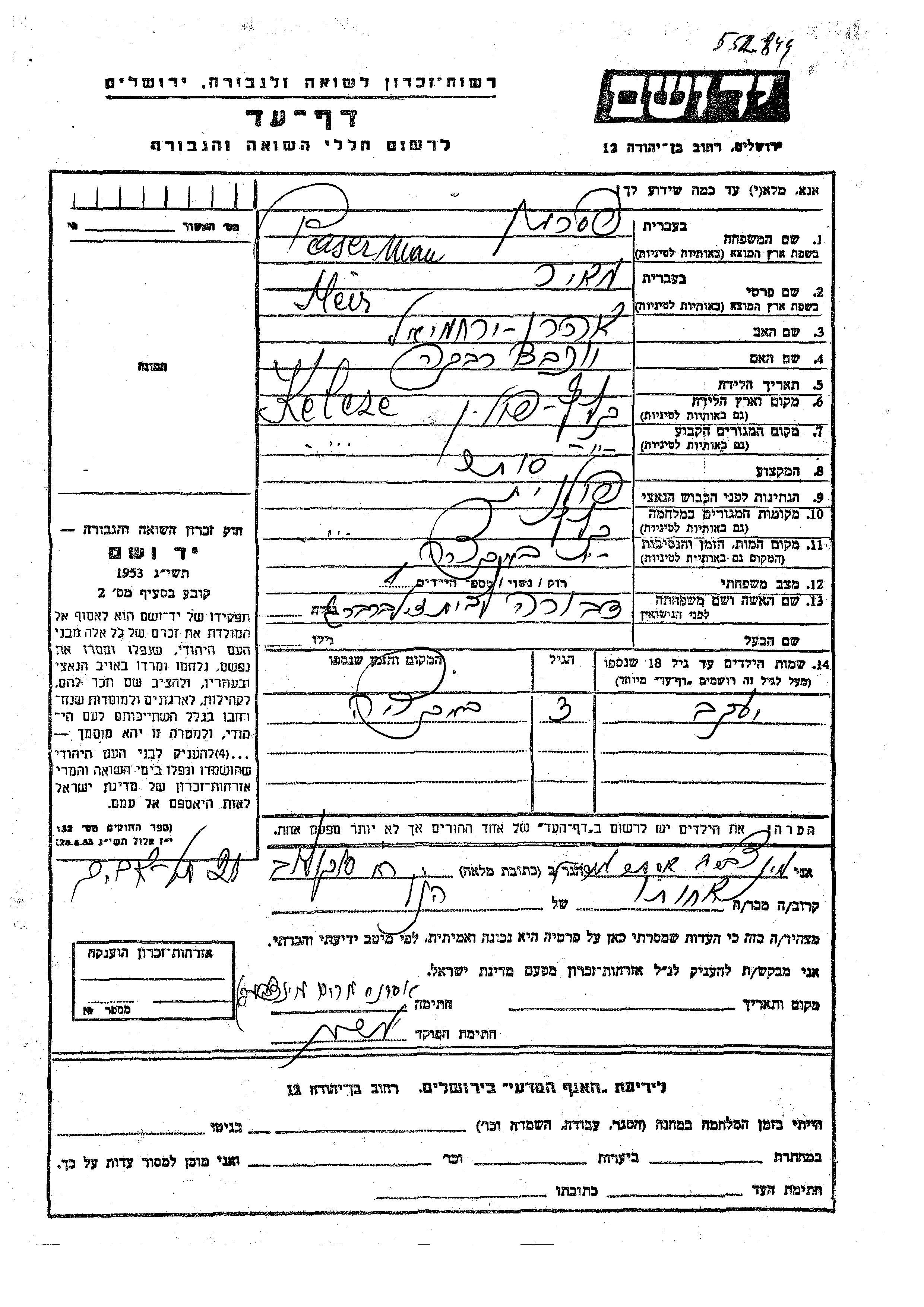Paserman Yaakov Kielce, Polen Gedenkblatt