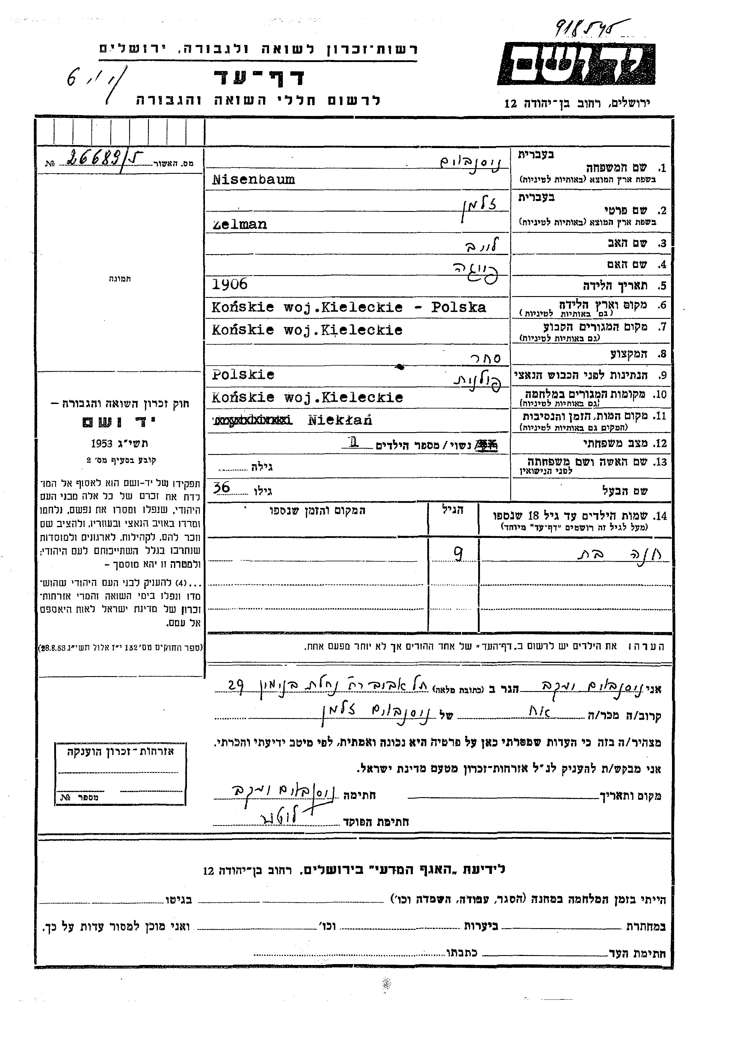 Nusenbaum Khana Konskie, Polen Gedenkblatt