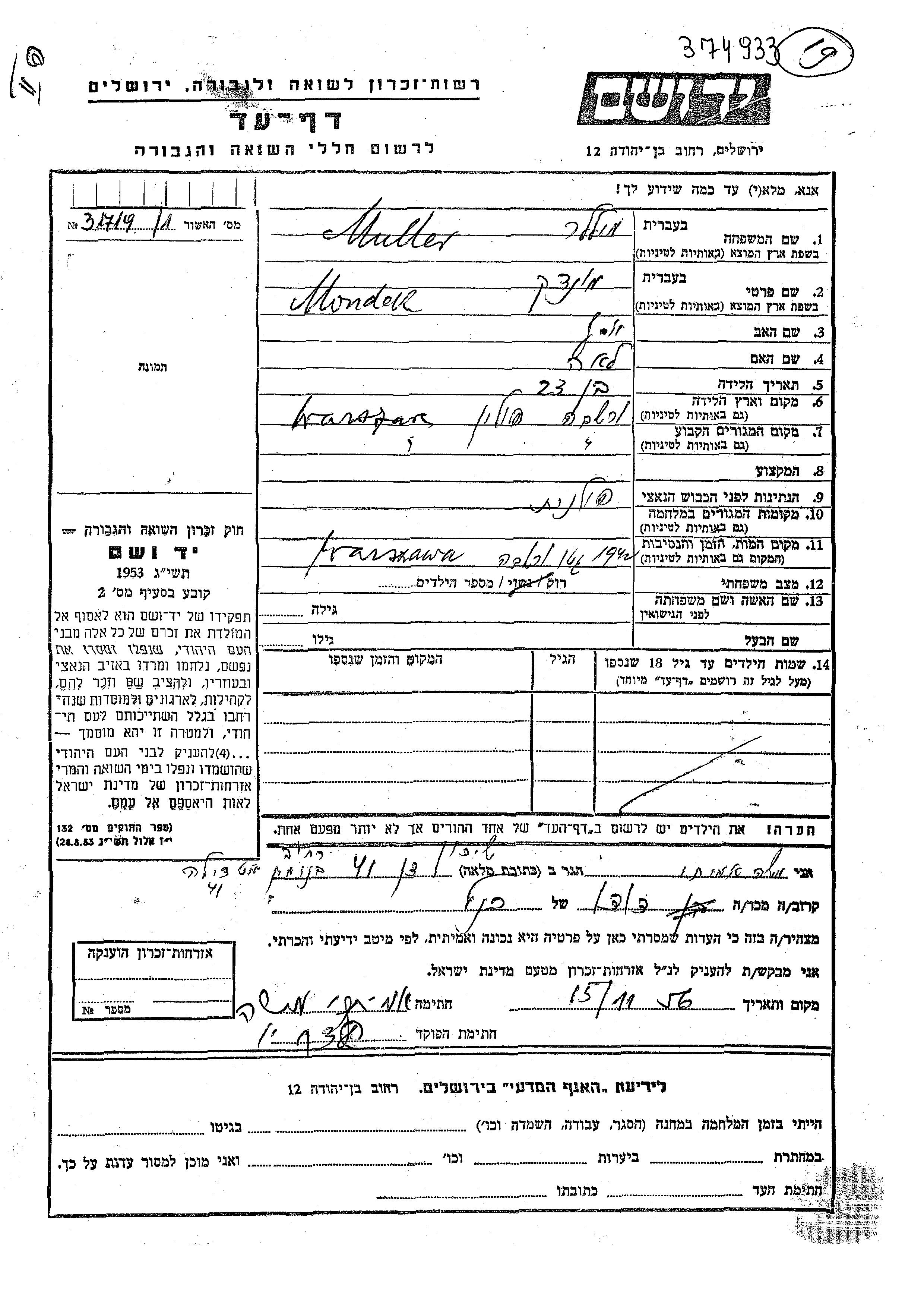 Mondek wurde in der Schoah ermordet. Todesort: Warszawa, Polen im Jahr 1942.
