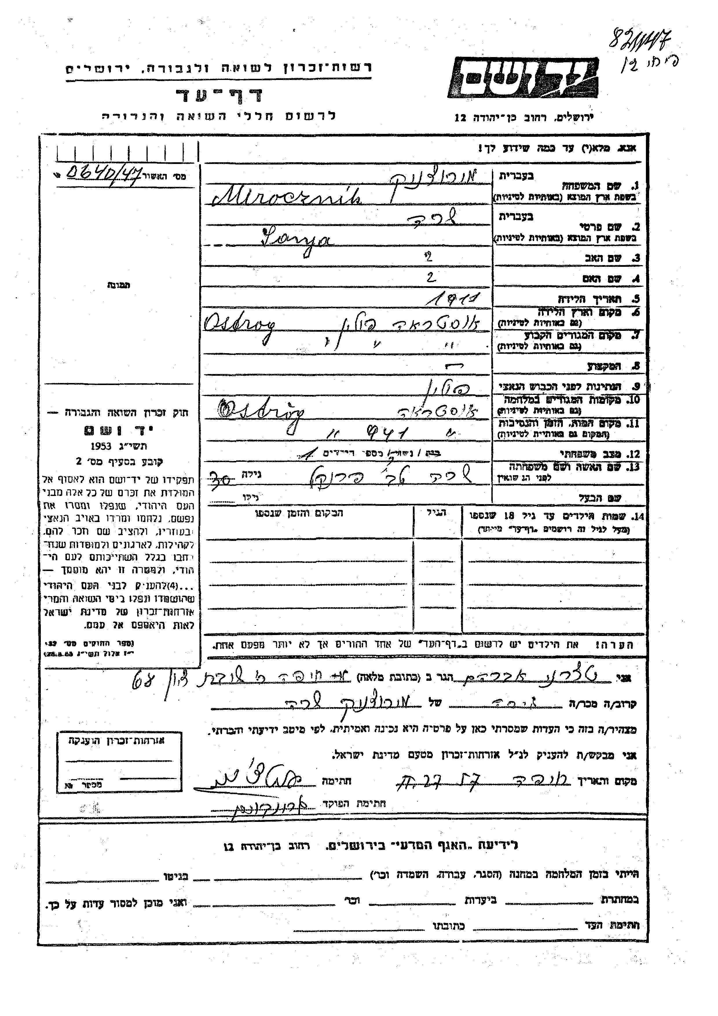 Sorya Mirocznik, geb. Frenkel wurde im Jahr 1911 in Ostrog, Polen geboren. Sie war Verheiratet. Vor dem Zweiten Weltkrieg lebte sie in Ostrog, Polen. Während des Krieges war sie in Ostrog, Polen.