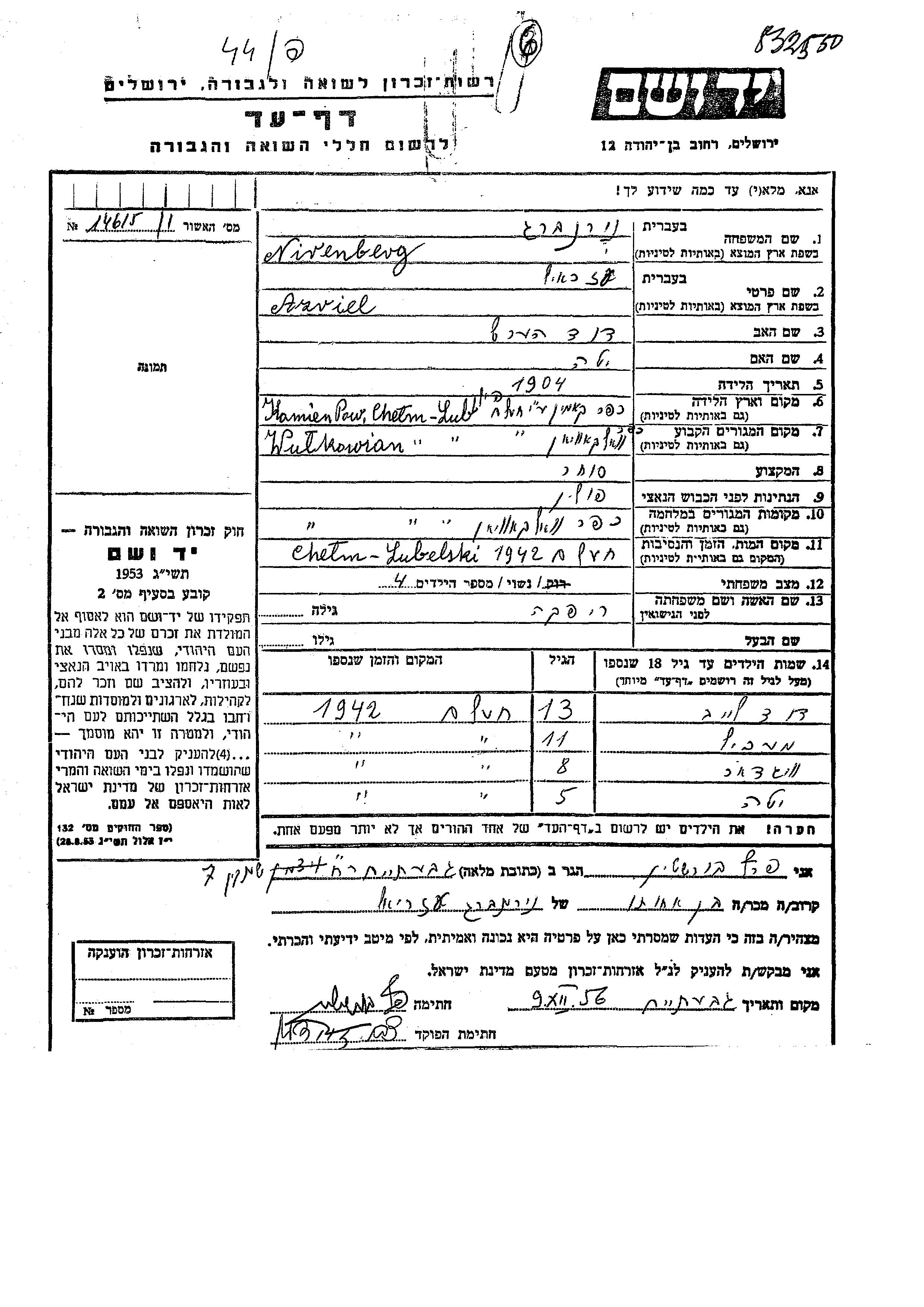 Mikhael Nirenberg wurde Er war der Sohn von Azriel und Rivka. Er war Kind. Vor dem Zweiten Weltkrieg lebte er in Wulkowian, Polen. Während des Krieges war er in Chelm, Polen.