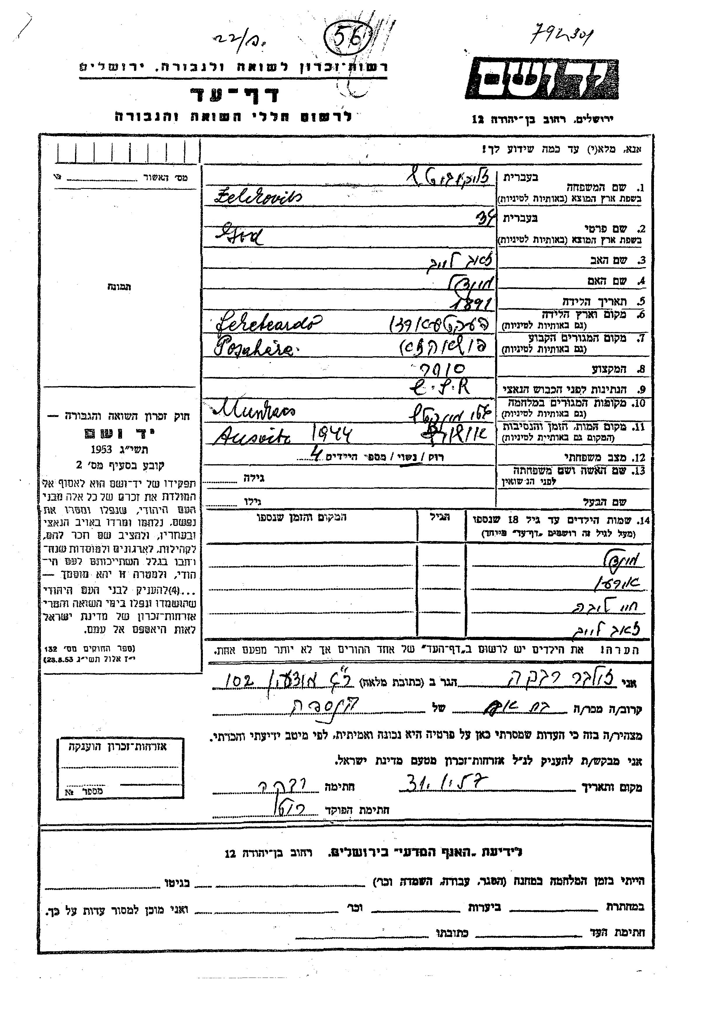 Mindl Zelikovitz wurde Er/sie war der/ die Sohn/Tochter von Gad. Er/Sie war Kind. Vor dem Zweiten Weltkrieg er/sie in Posahaza, Tschechoslowakei. Während des Krieges war er/sie in Munkac, Tschechoslowakei.