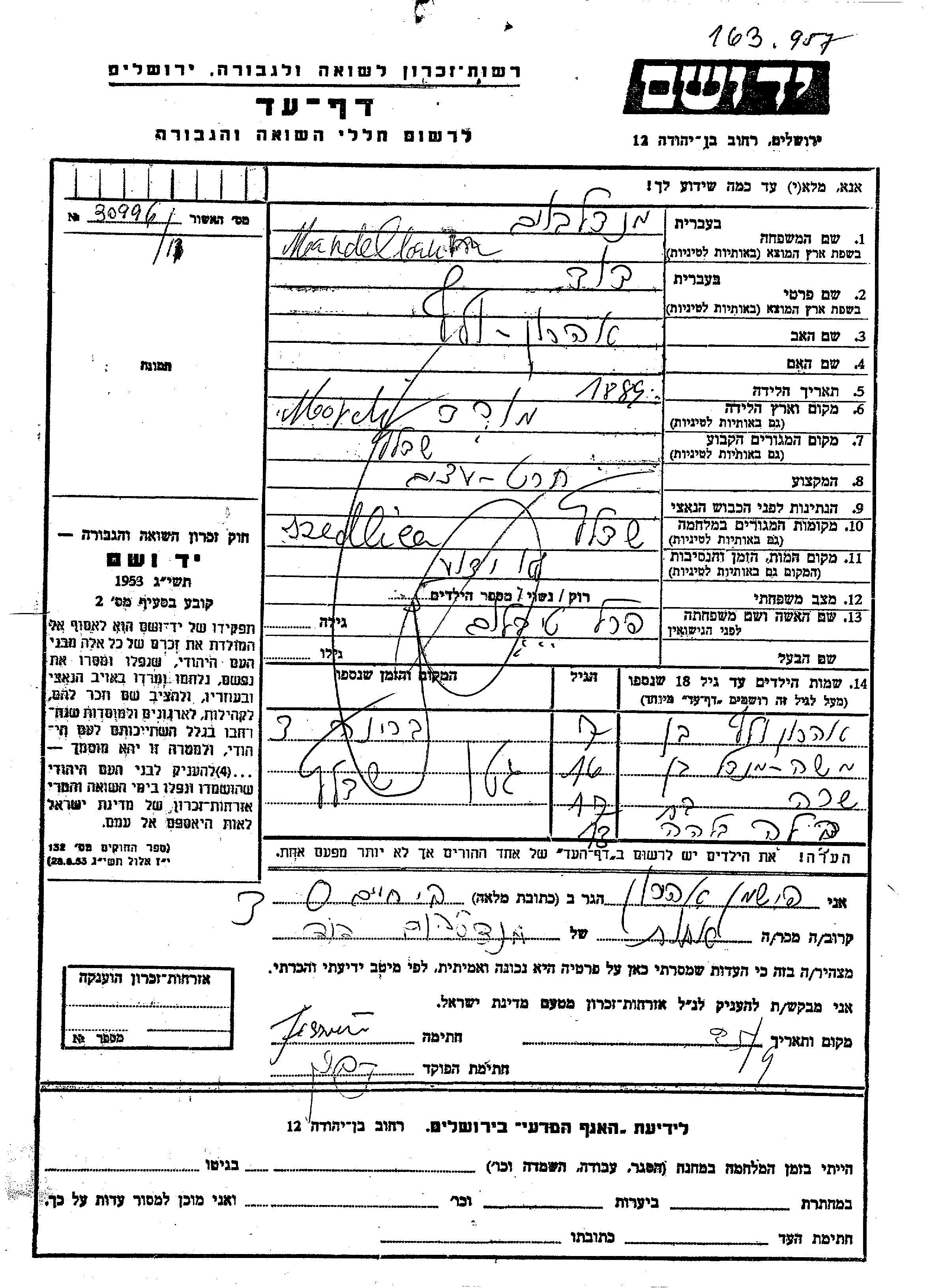 Bela Bilha Mandelbaum wurde Er/sie war der/ die Sohn/Tochter von David und Perel, geb. Teiblum. Er/Sie war Kind. Während des Krieges war er/sie in Szedliszka, Tschechoslowakei.