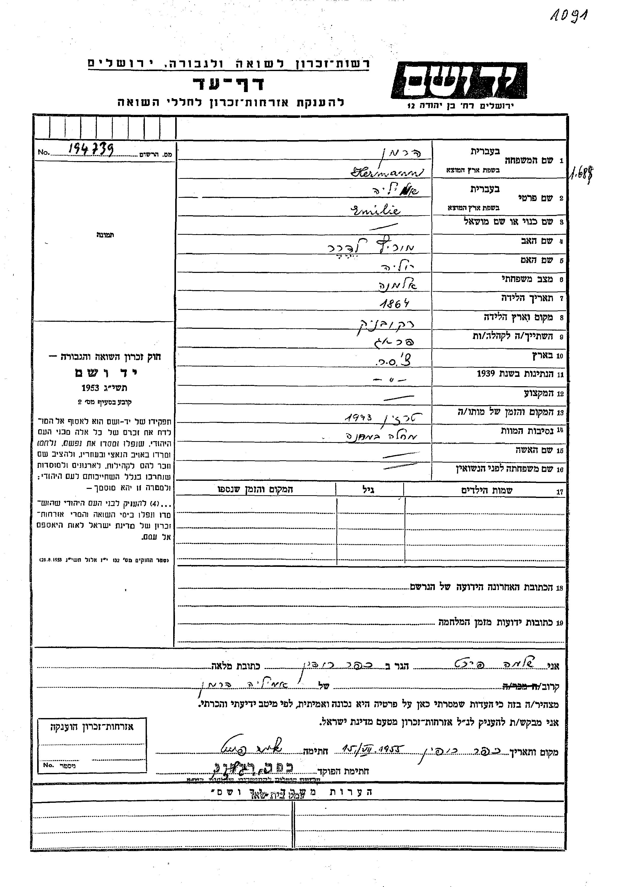 Emilie wurde in der Schoah ermordet. Todesort: Terezin, Tschechoslowakei im Jahr 1943.