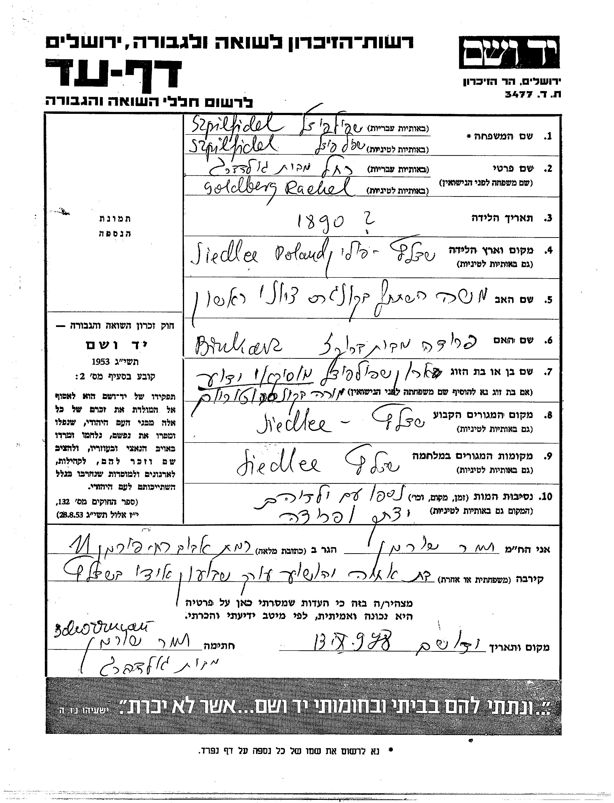 Frida Szpilfidel wurde Sie war die Tochter von Aron und Rachel, geb. Goldberg. Sie war Kind. Vor dem Zweiten Weltkrieg lebte sie in Siedlce, Polen. Während des Krieges war sie in Siedlce, Polen.