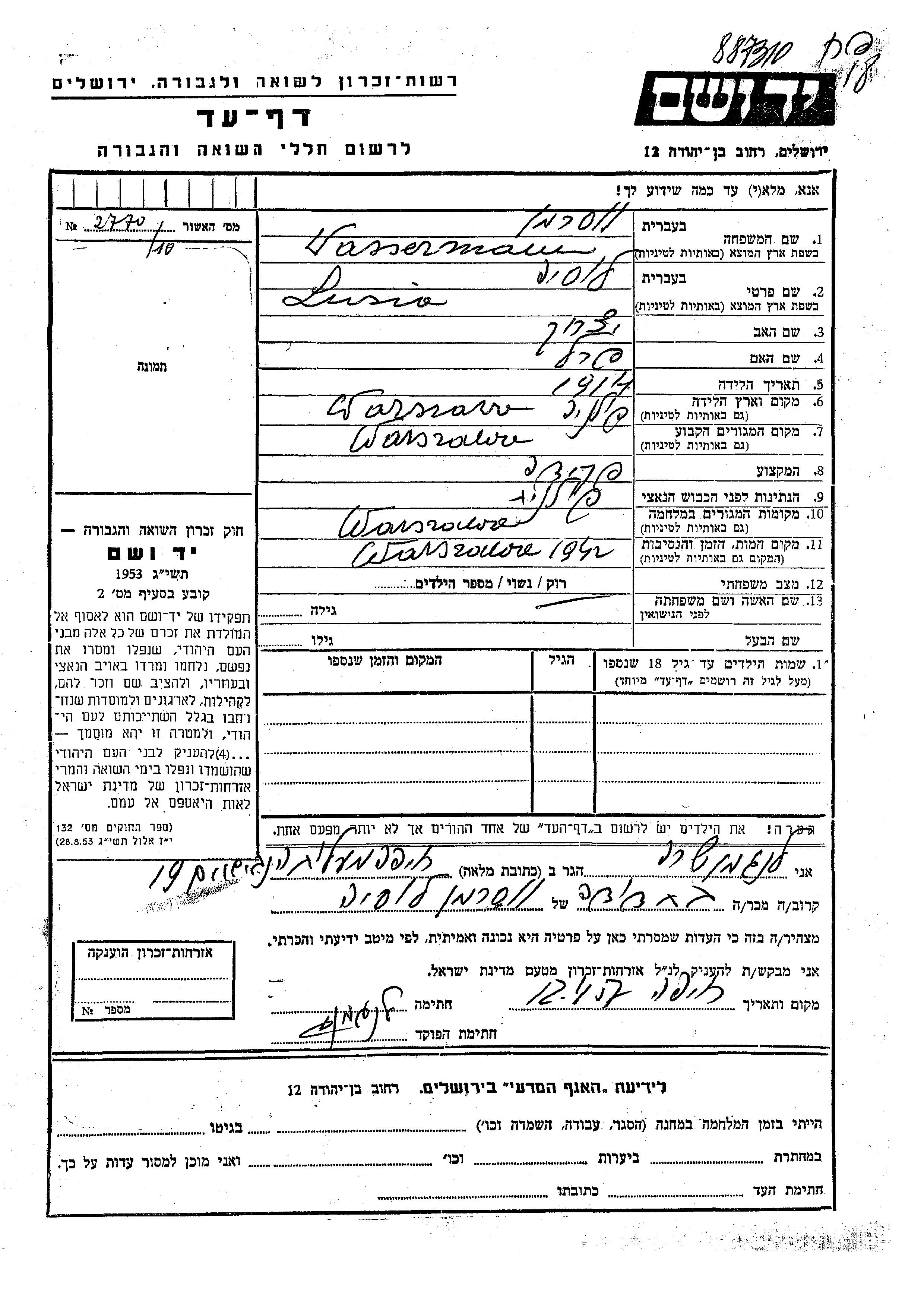Lusia Wasserman wurde im Jahr 1914 in Warsaw, Polen geboren. Sie war die Tochter von Yitzkhak und Perel. Sie war Angestellte/-r und Ledig. Vor dem Zweiten Weltkrieg lebte sie in Warsaw, Polen. Während des Krieges war sie in Warsaw, Polen.