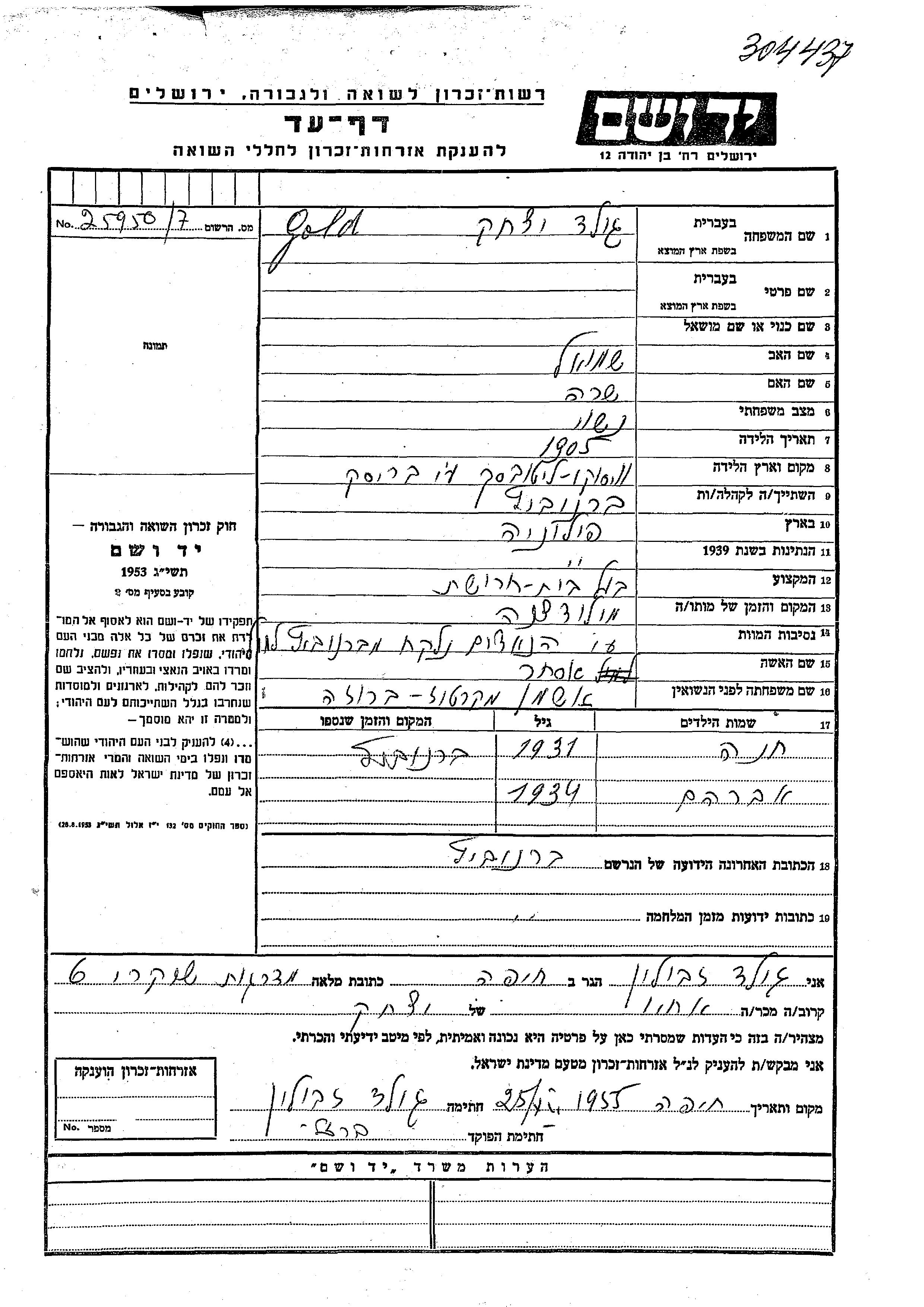 Avraham Gold wurde im Jahr 1934 geboren. Er war der Sohn von Yitzkhak und Ester, geb. Ashman. Er war Kind. Während des Krieges war er in Baranowicze, Polen.