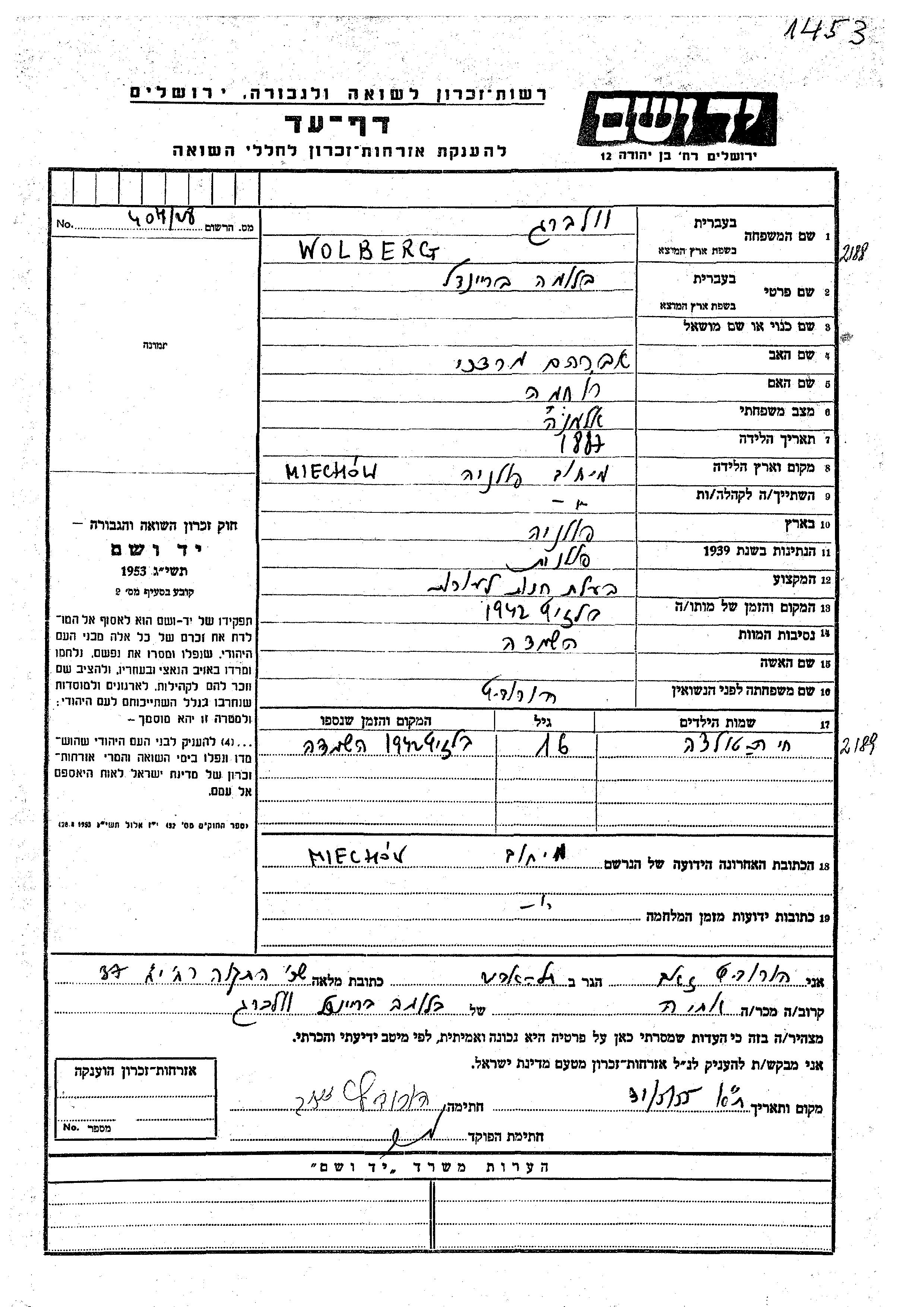 Khai Wolberg wurde Er/sie war der/ die Sohn/Tochter von Bluma Braindel, geb. Horovitz. Er/Sie war Kind. Vor dem Zweiten Weltkrieg er/sie in Miechow, Polen. Während des Krieges war er/sie in Miechow, Polen.