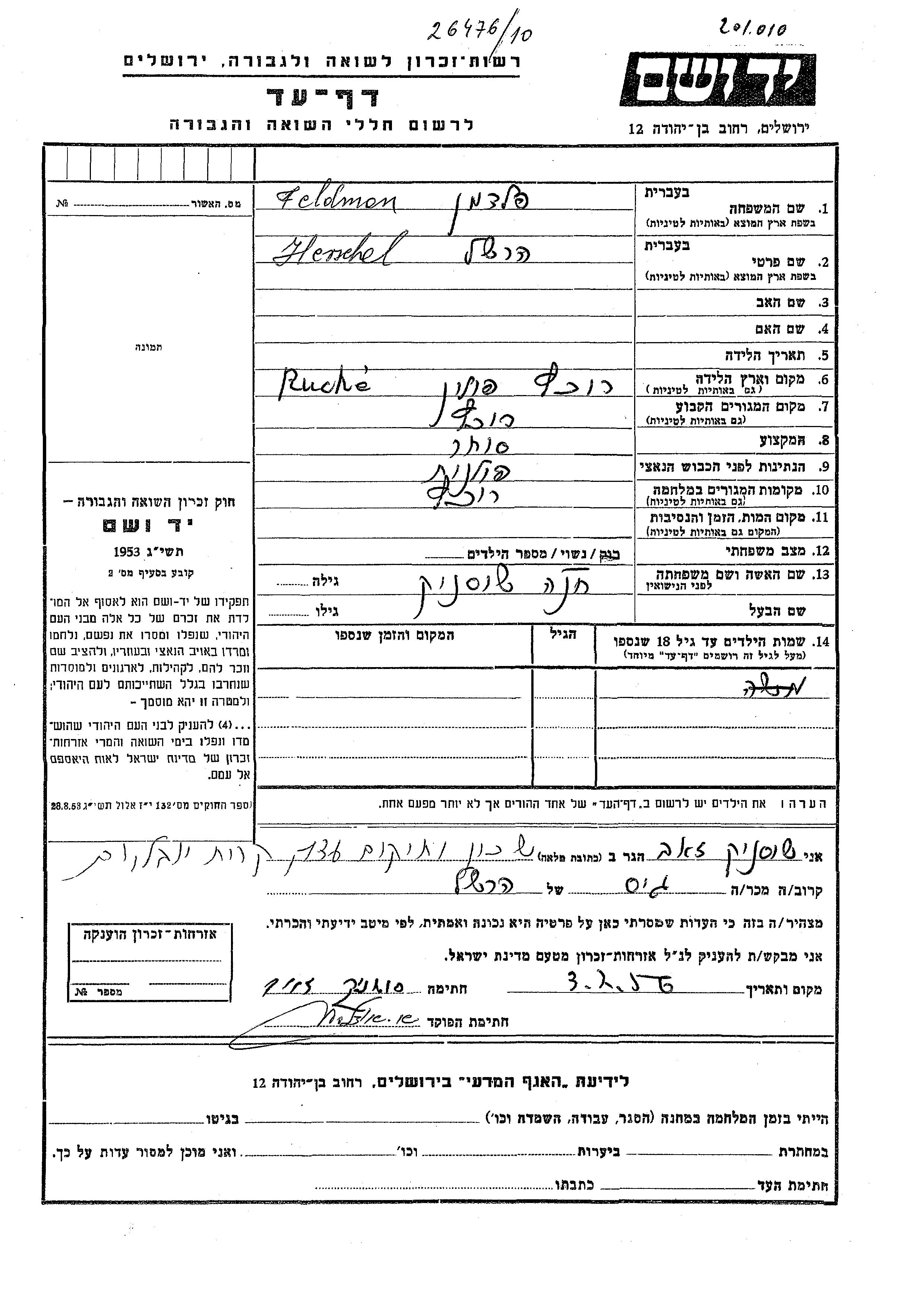Moshe Feldman wurde Er war der Sohn von Herschel und Khana, geb. Shosnik. Er war Kind. Vor dem Zweiten Weltkrieg lebte er in Rochow, Polen. Während des Krieges war er in Rochow, Polen.