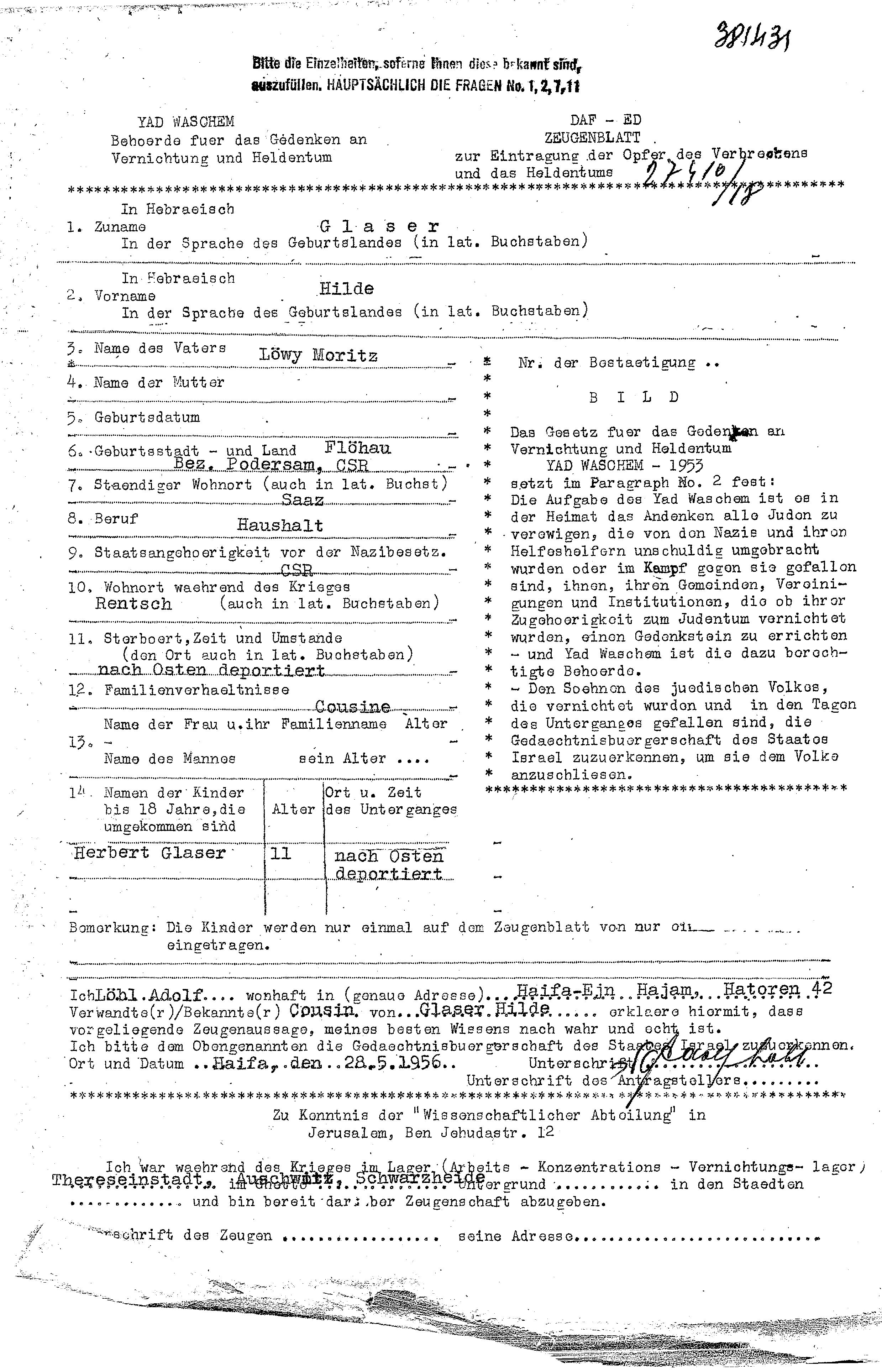 Hilde Glaser, geb. Löwy wurde in Floehau, Tschechoslowakei geboren. Sie war die Tochter von Moritz. Sie war Hausfrau und mit Alter Verheiratet. Vor dem Zweiten Weltkrieg lebte sie in Saaz, Tschechoslowakei. Während des Krieges war sie in Rentsch, Tschechoslowakei.