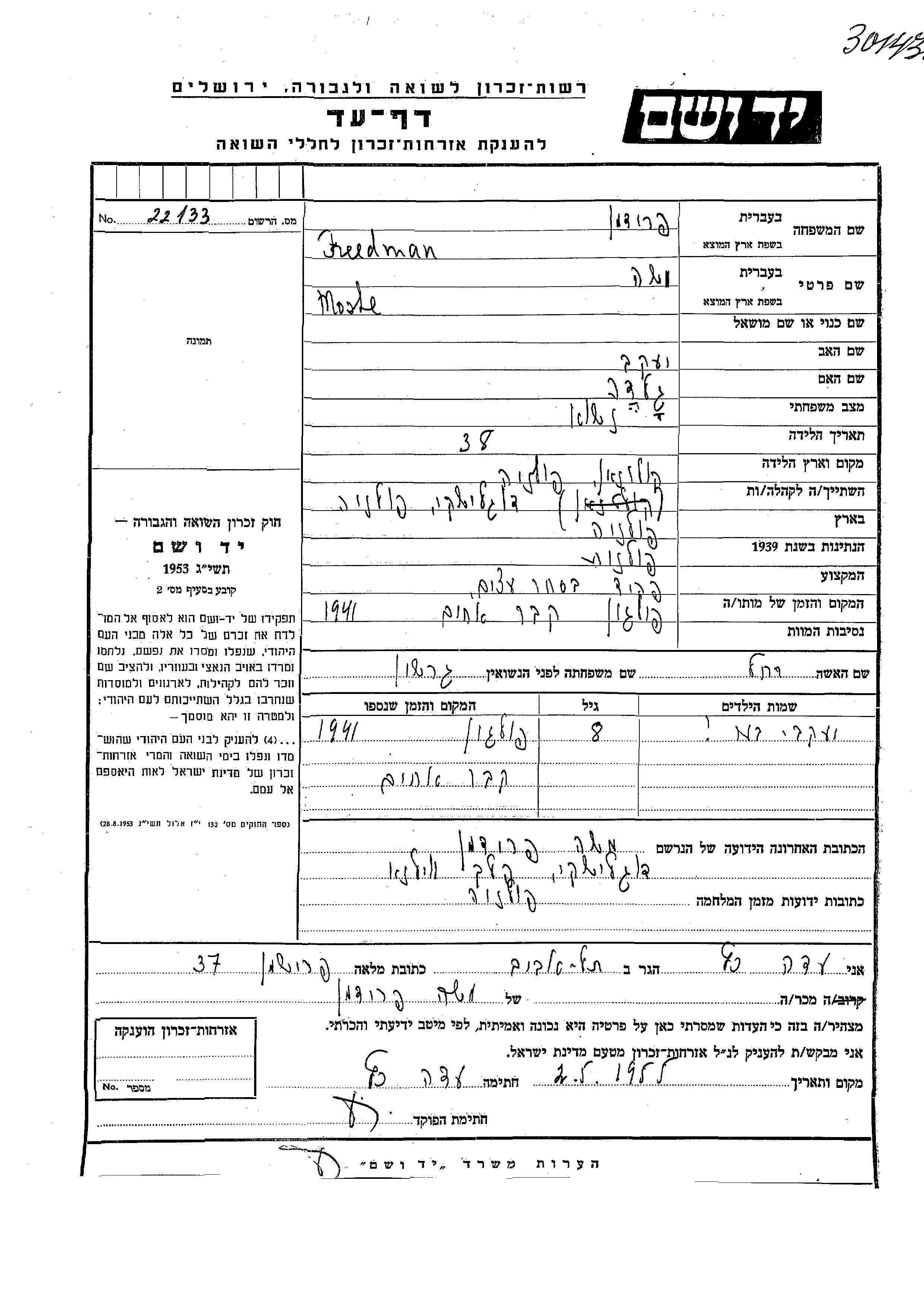 Yaakov Ber Freedman wurde Er war der Sohn von Moshe und Rakhel, geb. Gershon. Er war Kind. Vor dem Zweiten Weltkrieg lebte er in Dugeliszek, Polen. Während des Krieges war er in Dugeliszek, Polen.