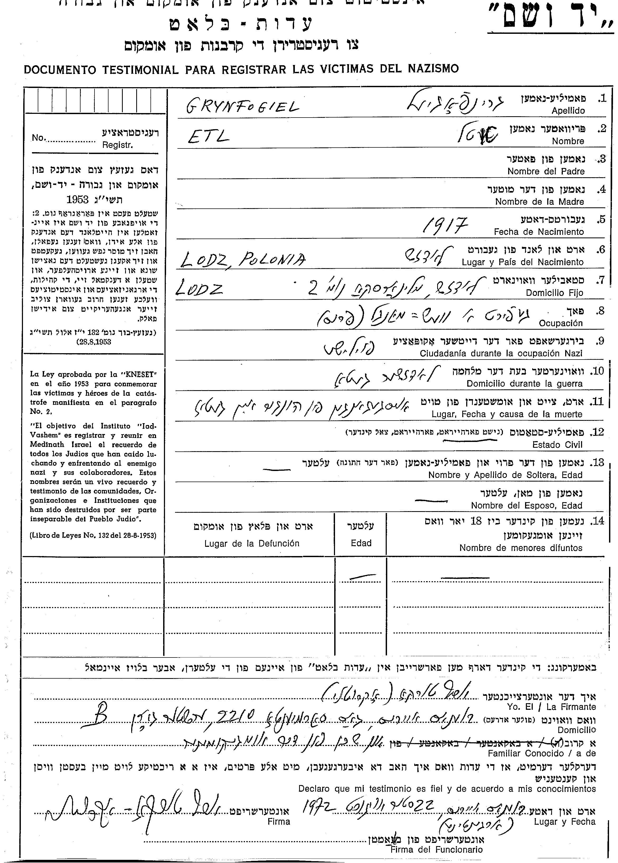 Etl Grynfogiel wurde im Jahr 1917 in Lodz, Polen geboren. Sie war בעלת מכבסה. Vor dem Zweiten Weltkrieg lebte sie in Lodz, Polen. Während des Krieges war sie in Lodz, Polen.