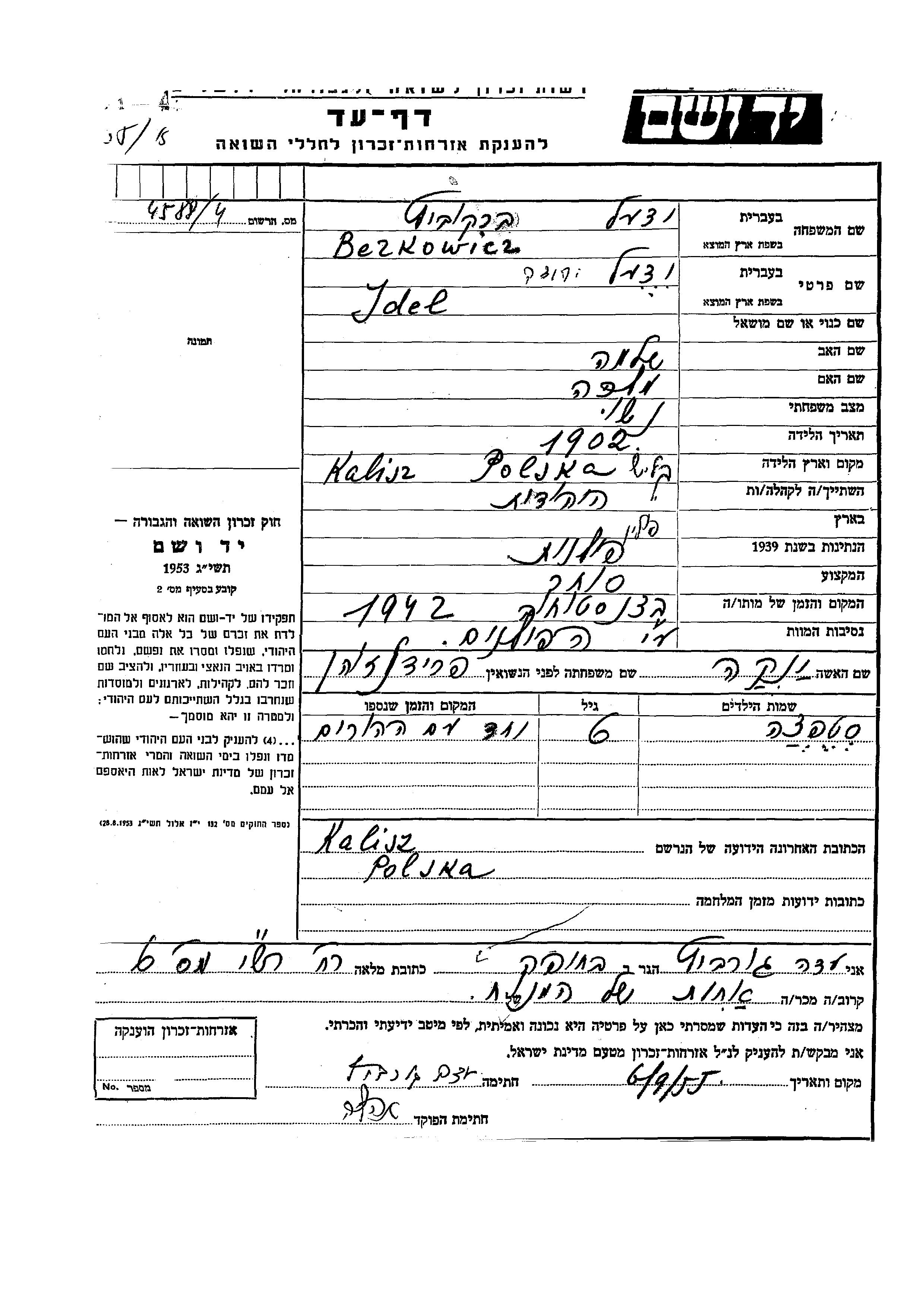 Berkowicz Stefache Kalisz, Polen Gedenkblatt