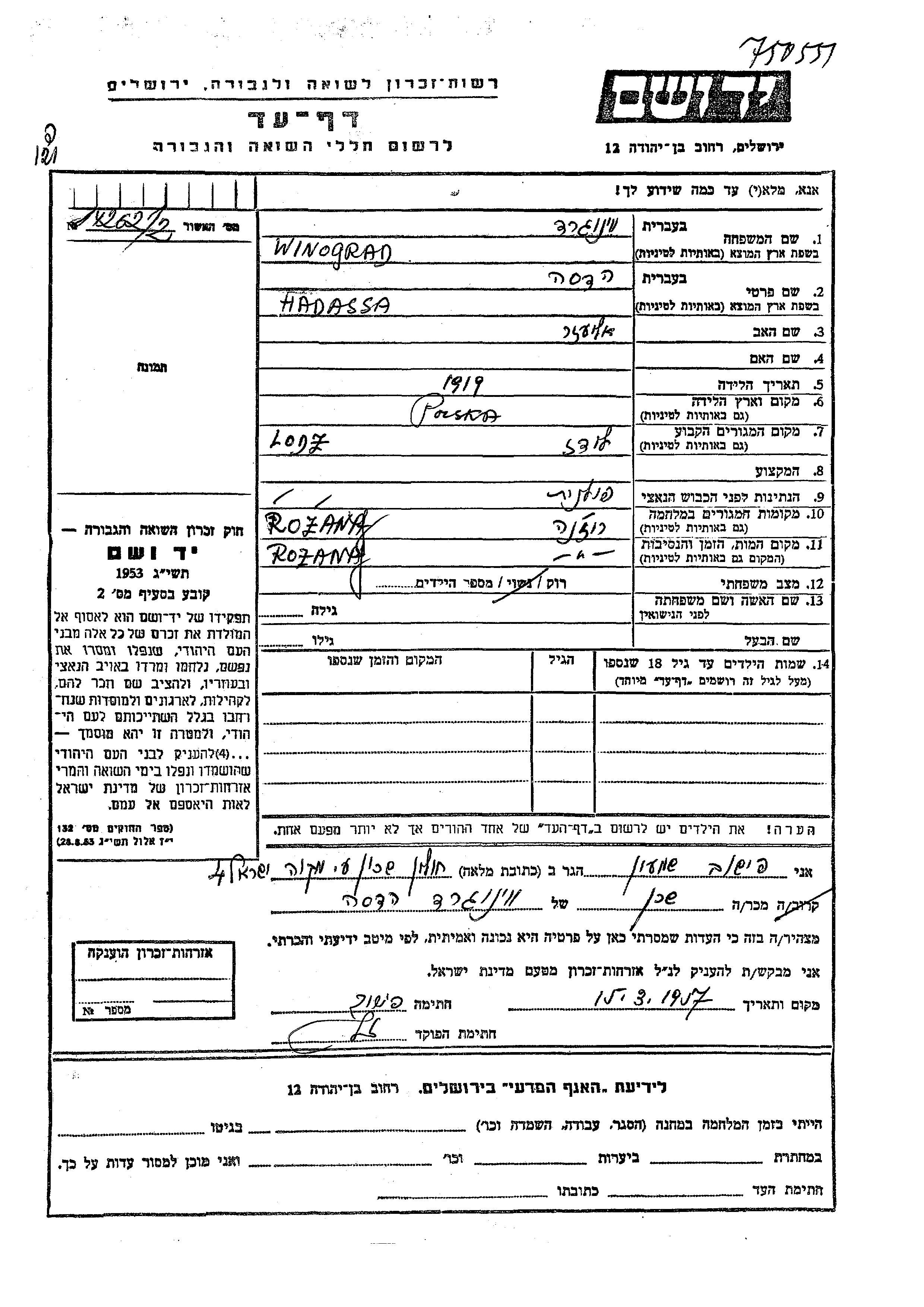 Hadassa Winograd wurde im Jahr 1919 in Polen geboren. Sie war die Tochter von Eliezer. Sie war Ledig. Vor dem Zweiten Weltkrieg lebte sie in Lodz, Polen. Während des Krieges war sie in Rozana, Polen.