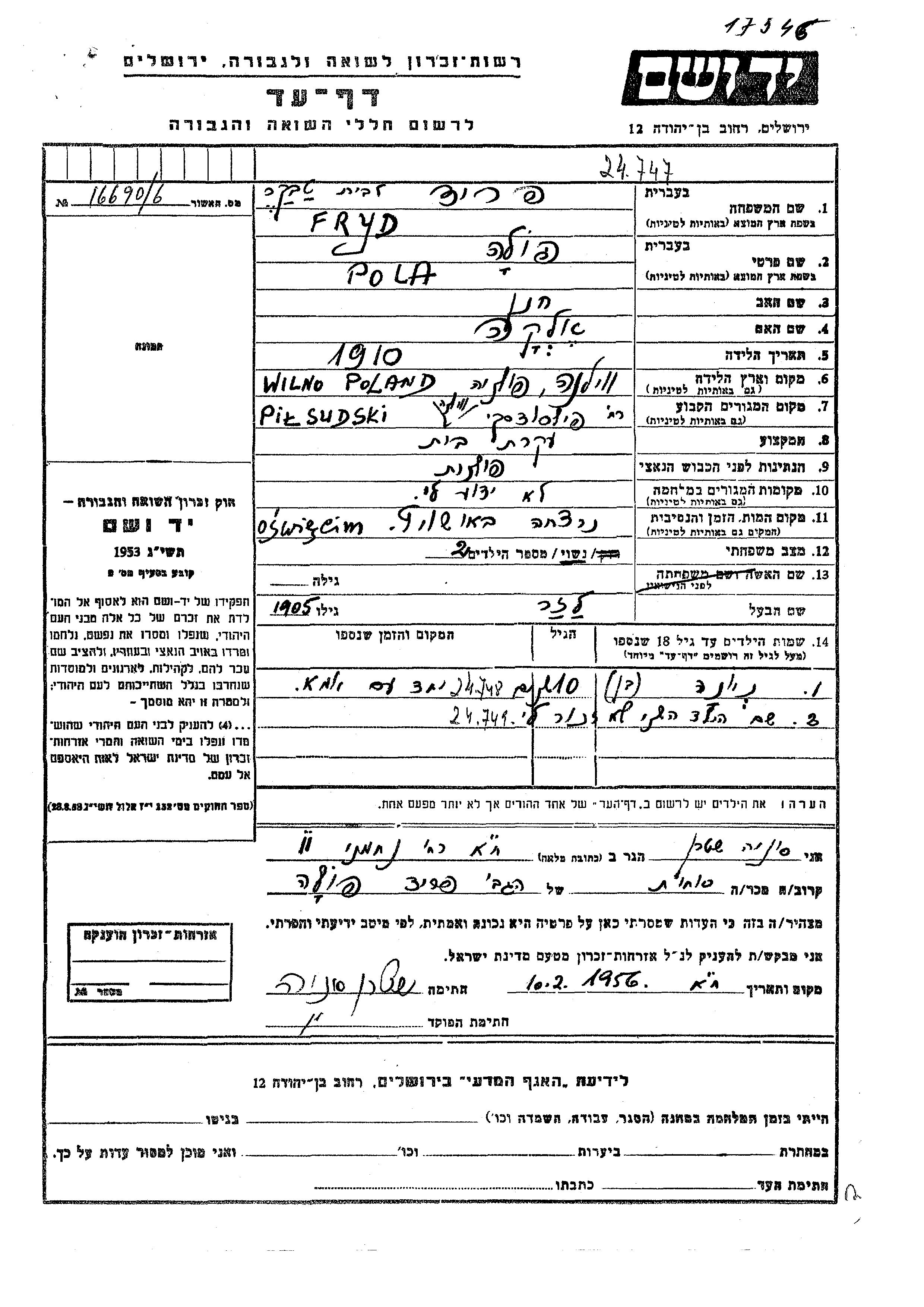 Niunia Fryd wurde Er/sie war der/ die Sohn/Tochter von Lazar und Pola, geb. Tabaker. Er/Sie war Kind. Vor dem Zweiten Weltkrieg er/sie in Wilno, Polen.
