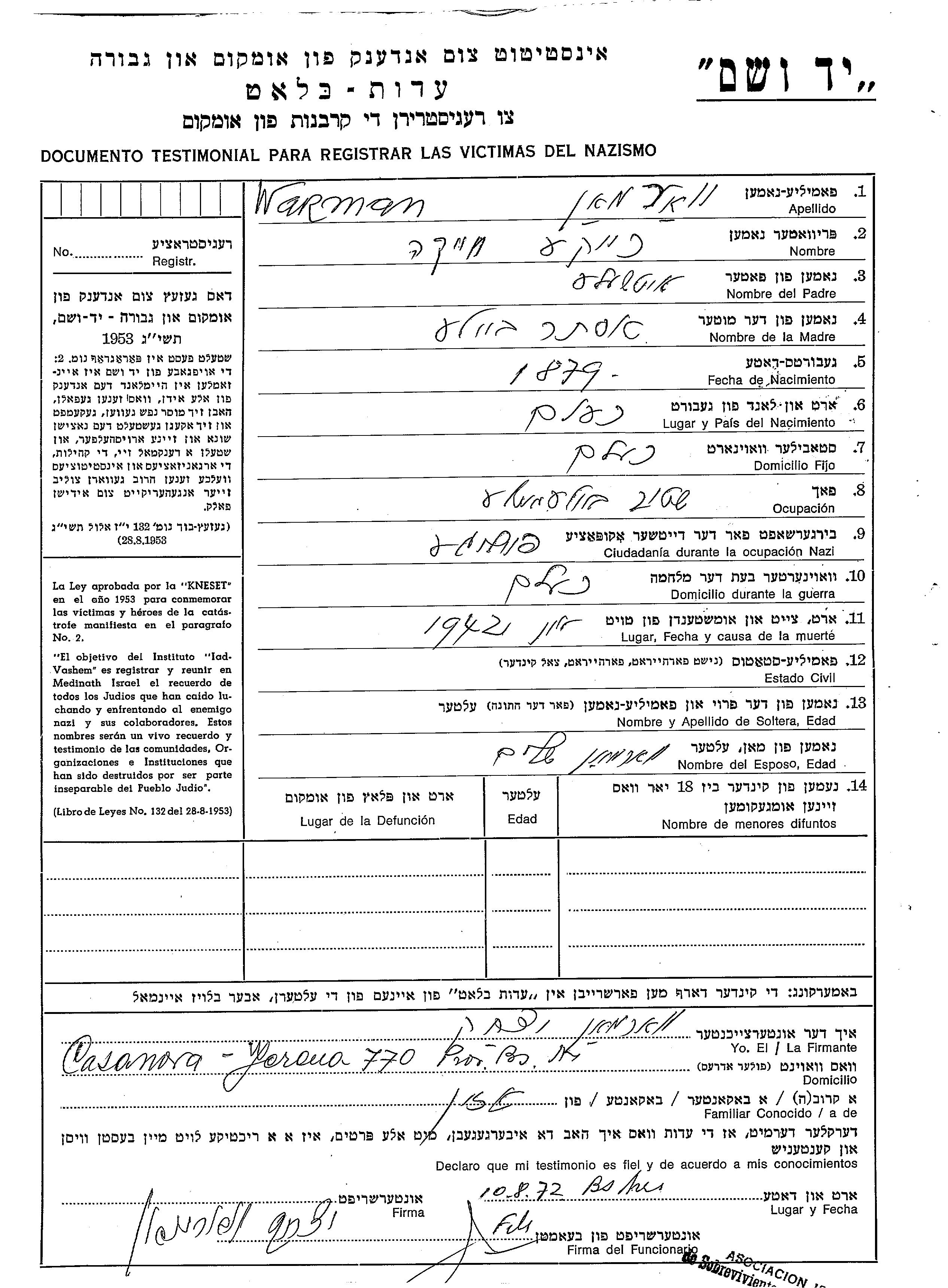 Khaia Warman wurde im Jahr 1879 in Chelm, Polen geboren. Sie war die Tochter von Yitzkhak und Ester Beile. Sie war Hausfrau und mit Shalom Verheiratet. Vor dem Zweiten Weltkrieg lebte sie in Chelm, Polen. Während des Krieges war sie in Chelm, Polen.