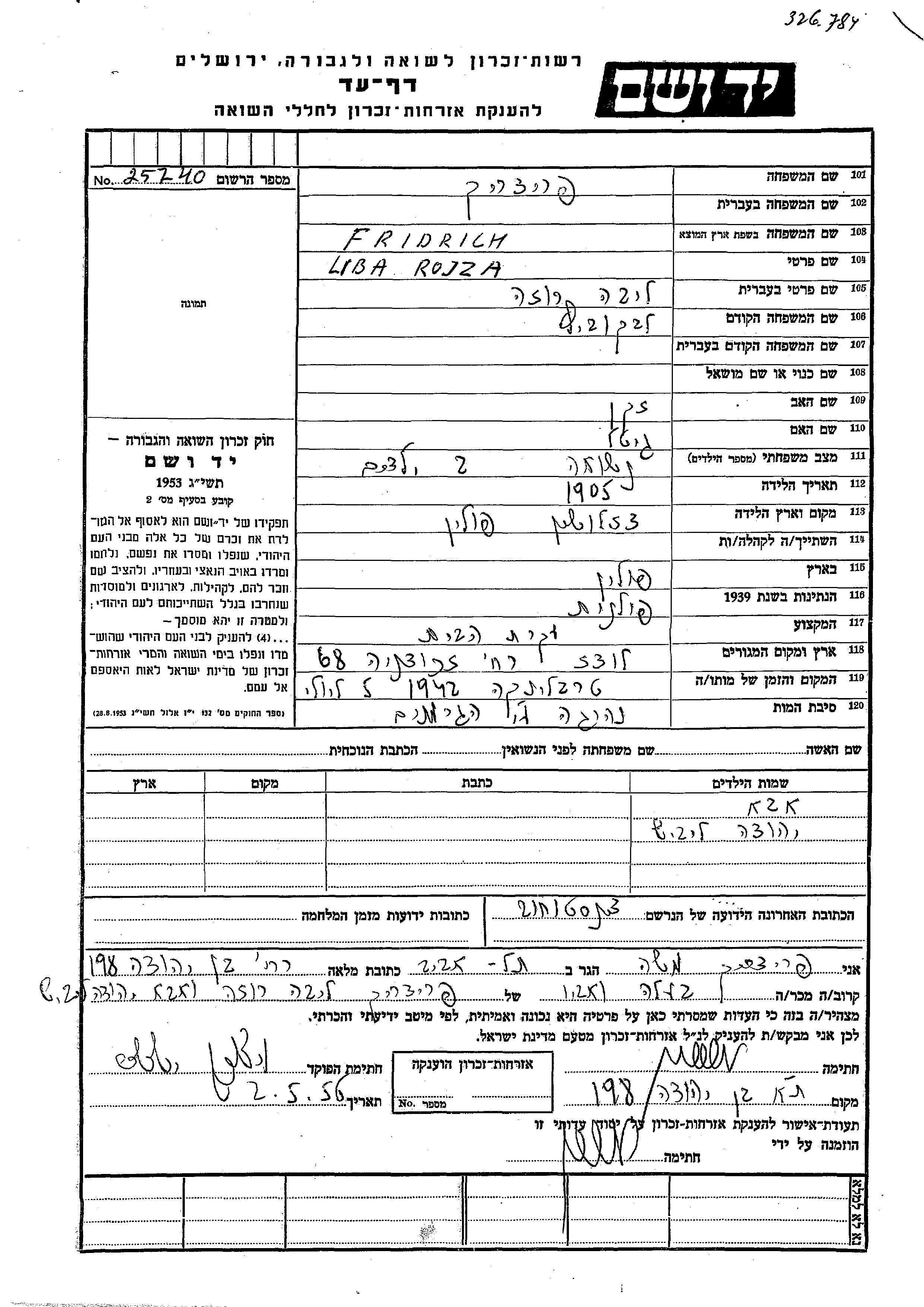 Yehuda Leibish Fridrich wurde Er war der Sohn von Moshe und Roza Liba, geb. Levkovitz. Er war Kind. Vor dem Zweiten Weltkrieg lebte er in Lodz, Polen. Während des Krieges war er in Czestochowa, Polen.