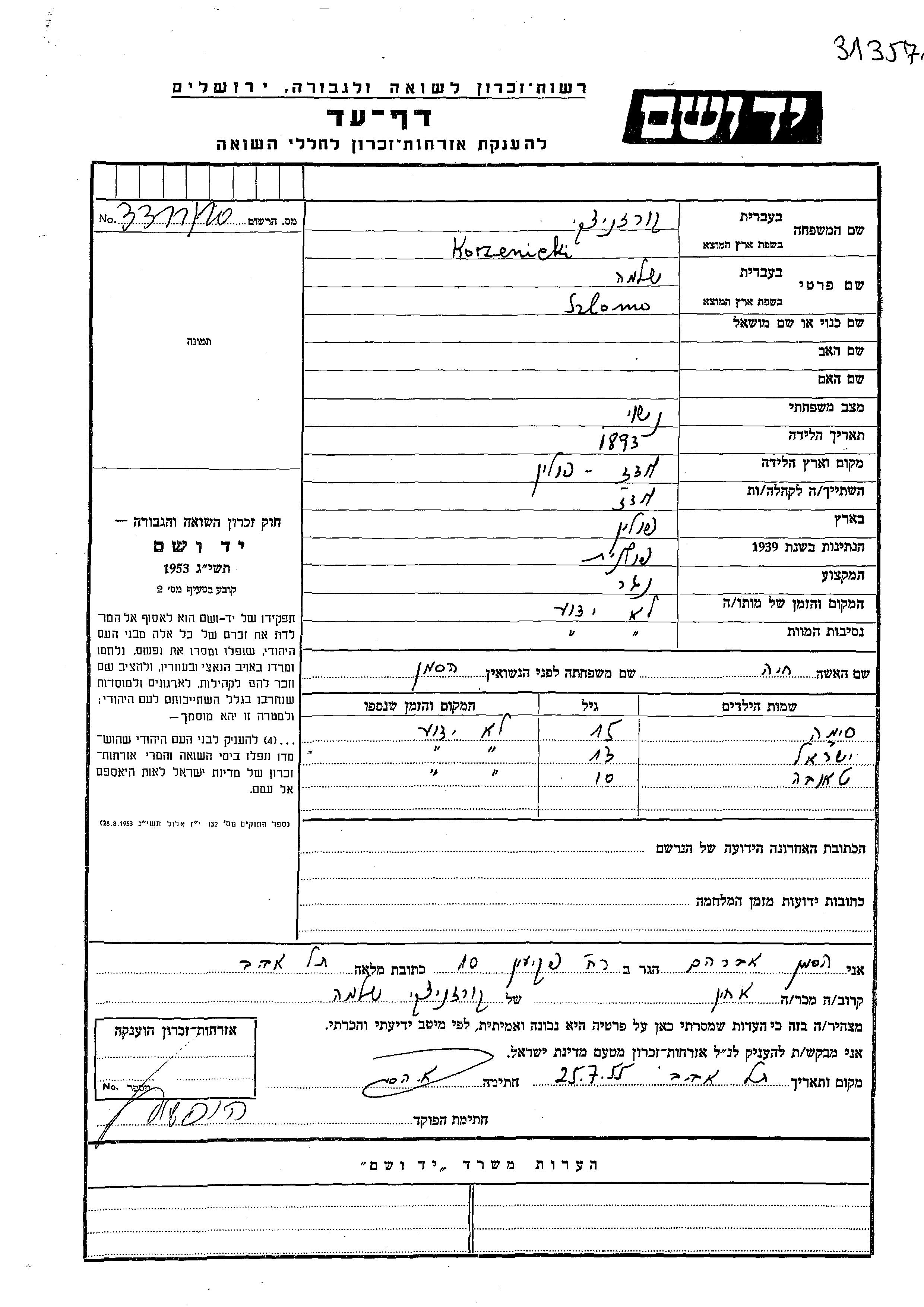 Yisrael Korzenicki wurde Er war der Sohn von Szlomo und Khaia, geb. Hasman. Er war Kind. Vor dem Zweiten Weltkrieg lebte er in Lodz, Polen. Während des Krieges war er in Polen.