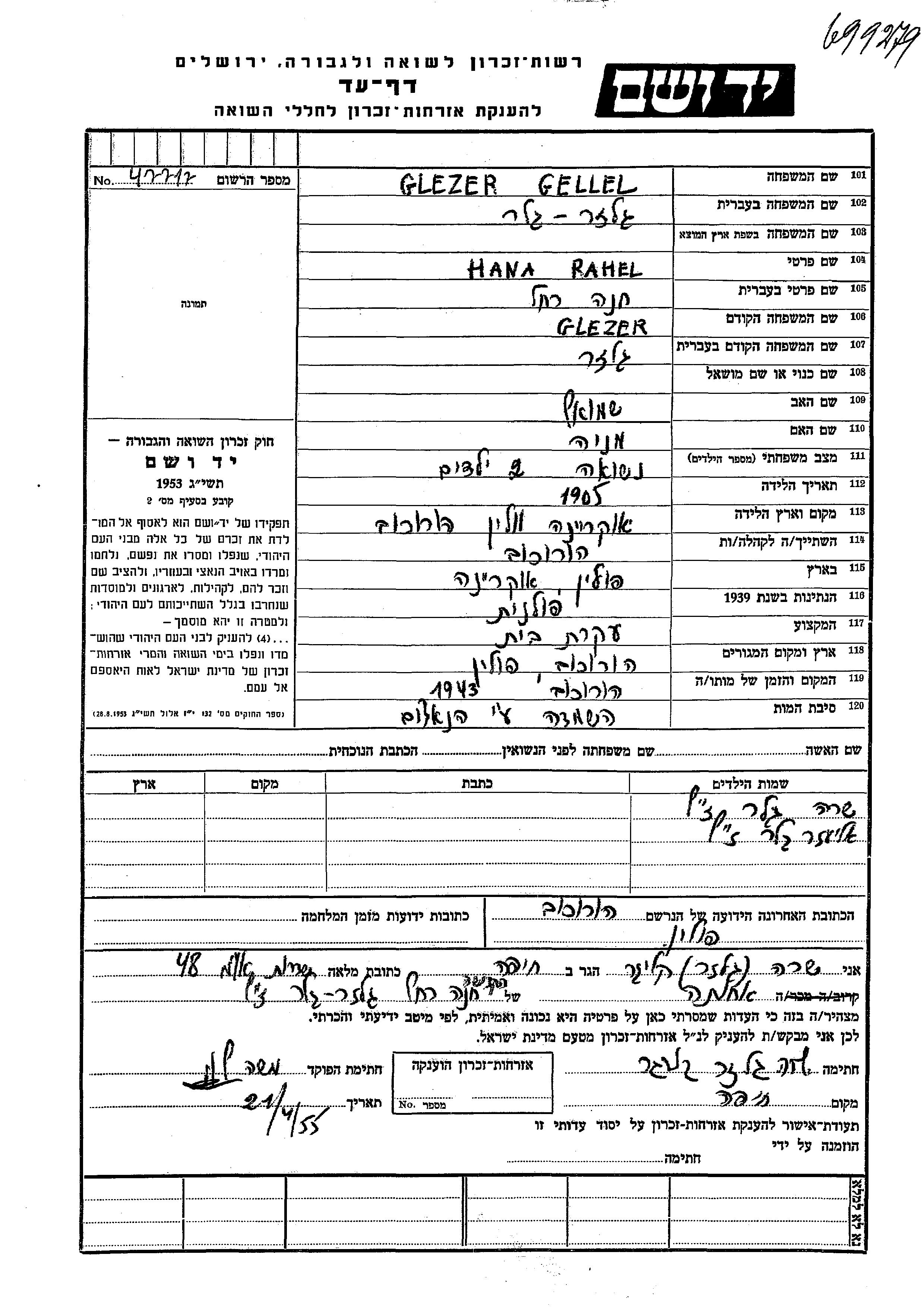 Sara Geller wurde Sie war die Tochter von Hana Rahel, geb. Glazer. Sie war Kind. Während des Krieges war sie in Horochow, Polen.