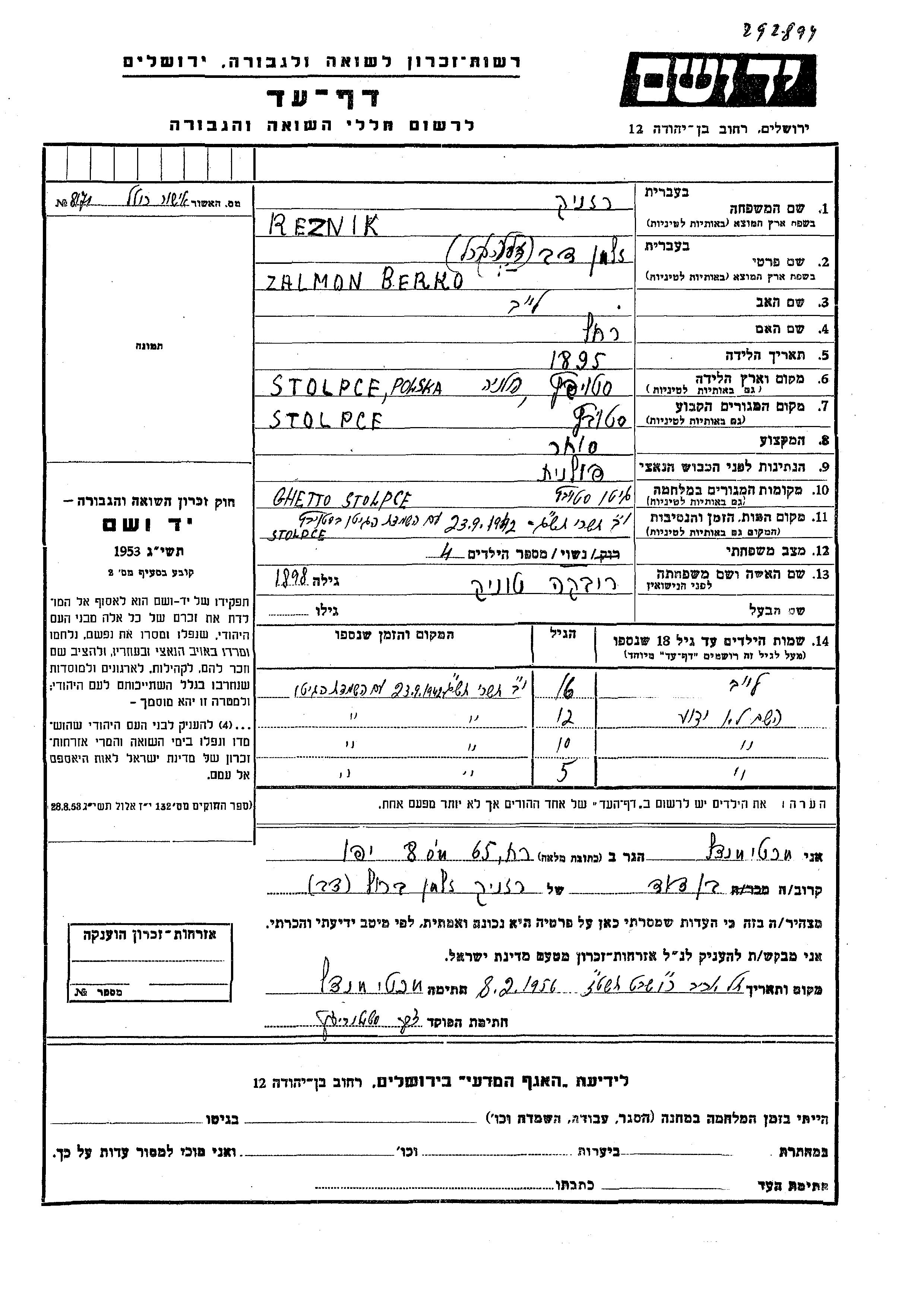 Reznik Vorname unbekannt Stolpce, Polen Gedenkblatt