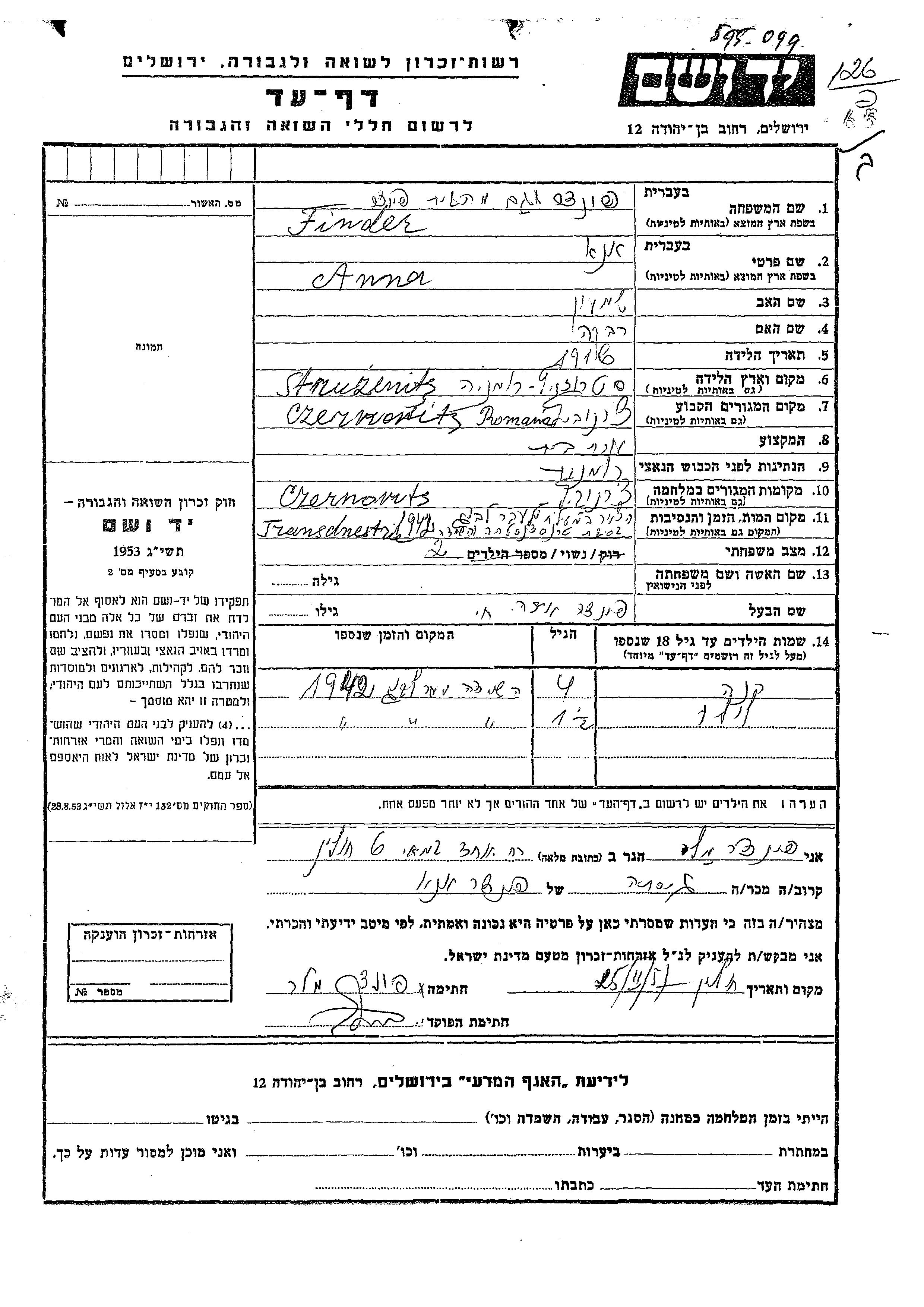 Rene Finder wurde Er/sie war der/ die Sohn/Tochter von Arie und Anna, geb. Finder. Er/Sie war Kind. Vor dem Zweiten Weltkrieg er/sie in Czernowitz, Rumänien. Während des Krieges war er/sie in Czernowitz, Rumänien.