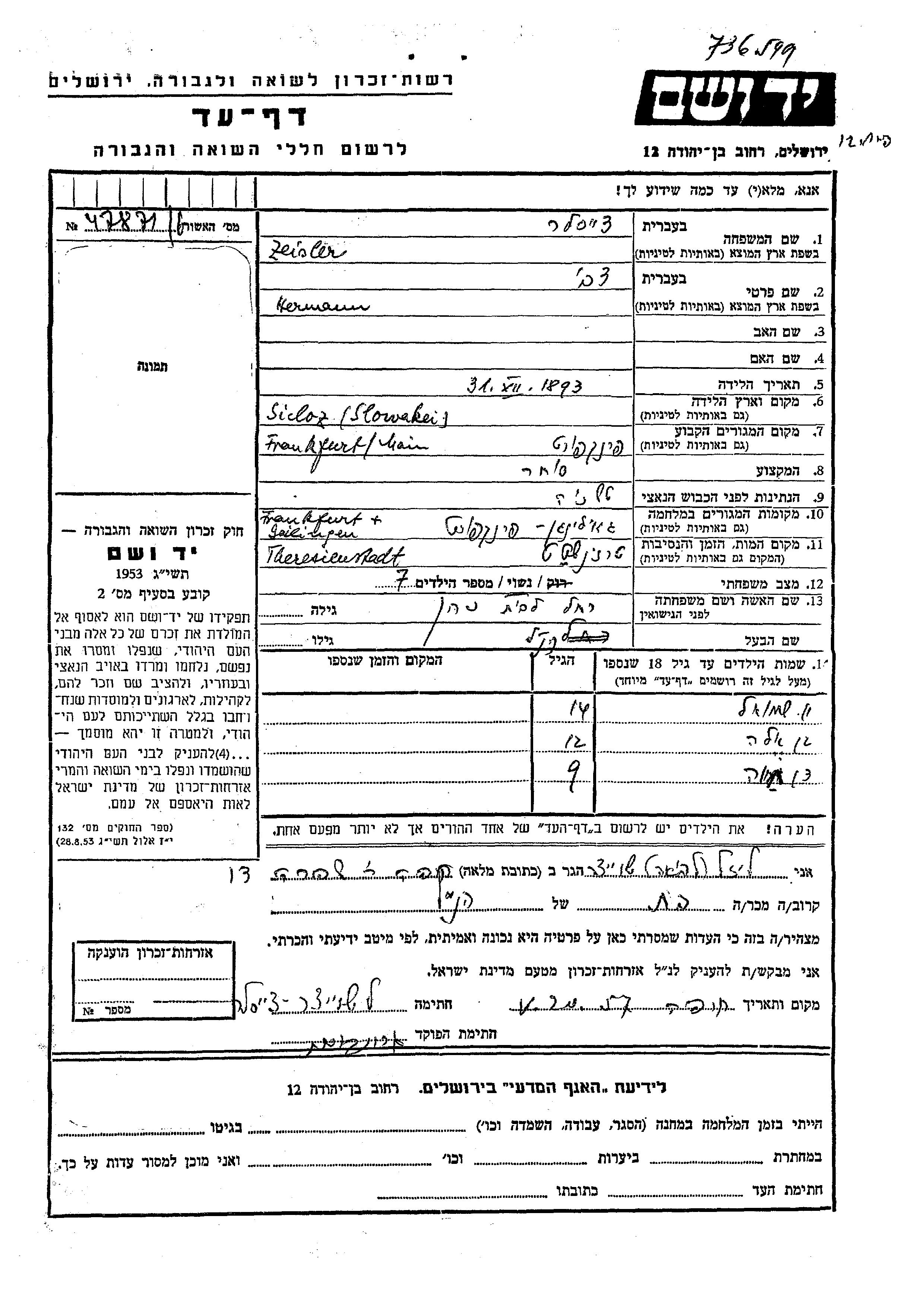 Chesler Zeisler Khava Khaia Frankfurt am Main, Deutsches Reich Gedenkblatt