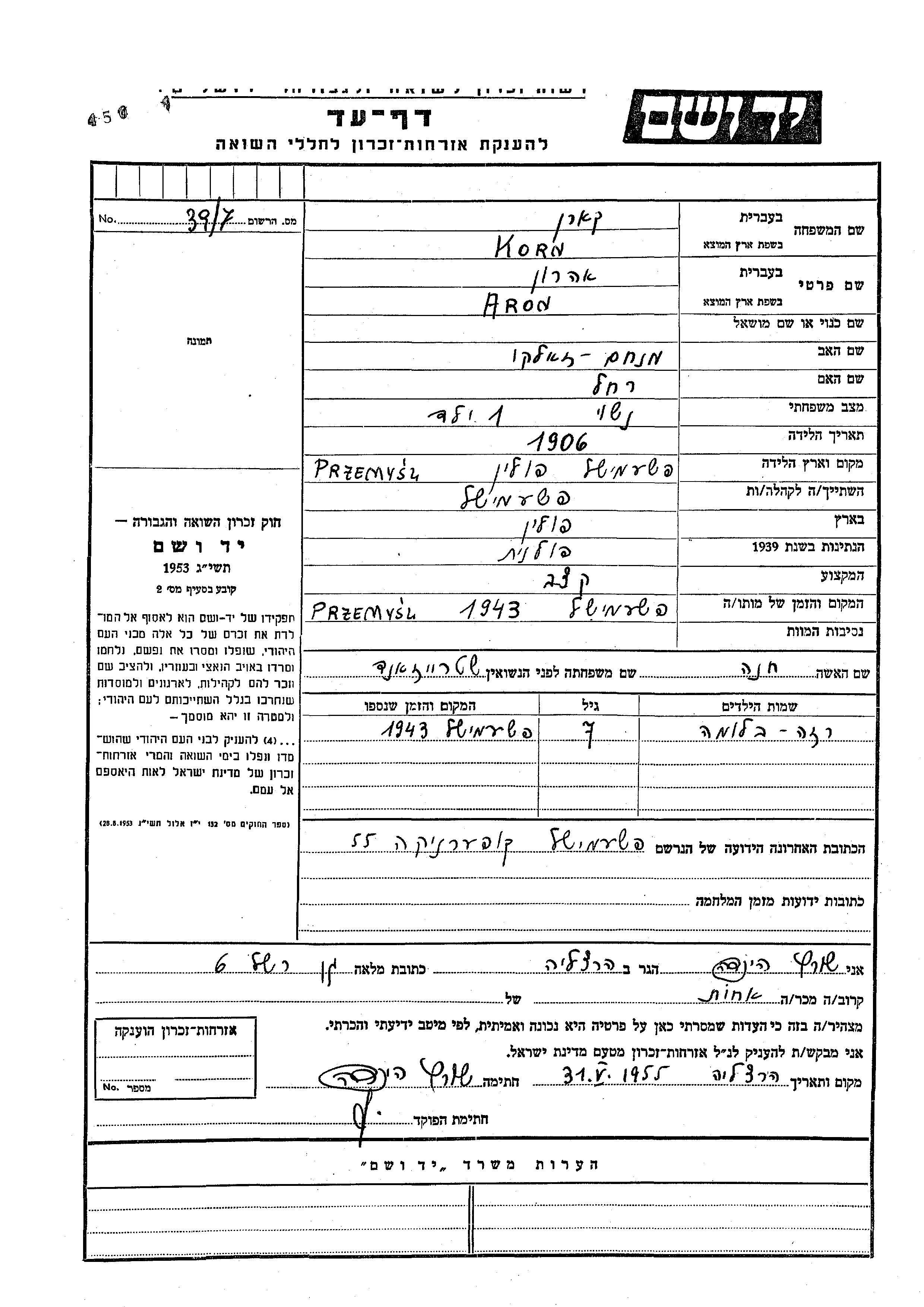 Reze Bluma Korn wurde Er/sie war der/ die Sohn/Tochter von Aron und Khana, geb. Shtreizand. Er/Sie war Kind. Vor dem Zweiten Weltkrieg er/sie in Przemysl, Polen. Während des Krieges war er/sie in Przemysl, Polen.