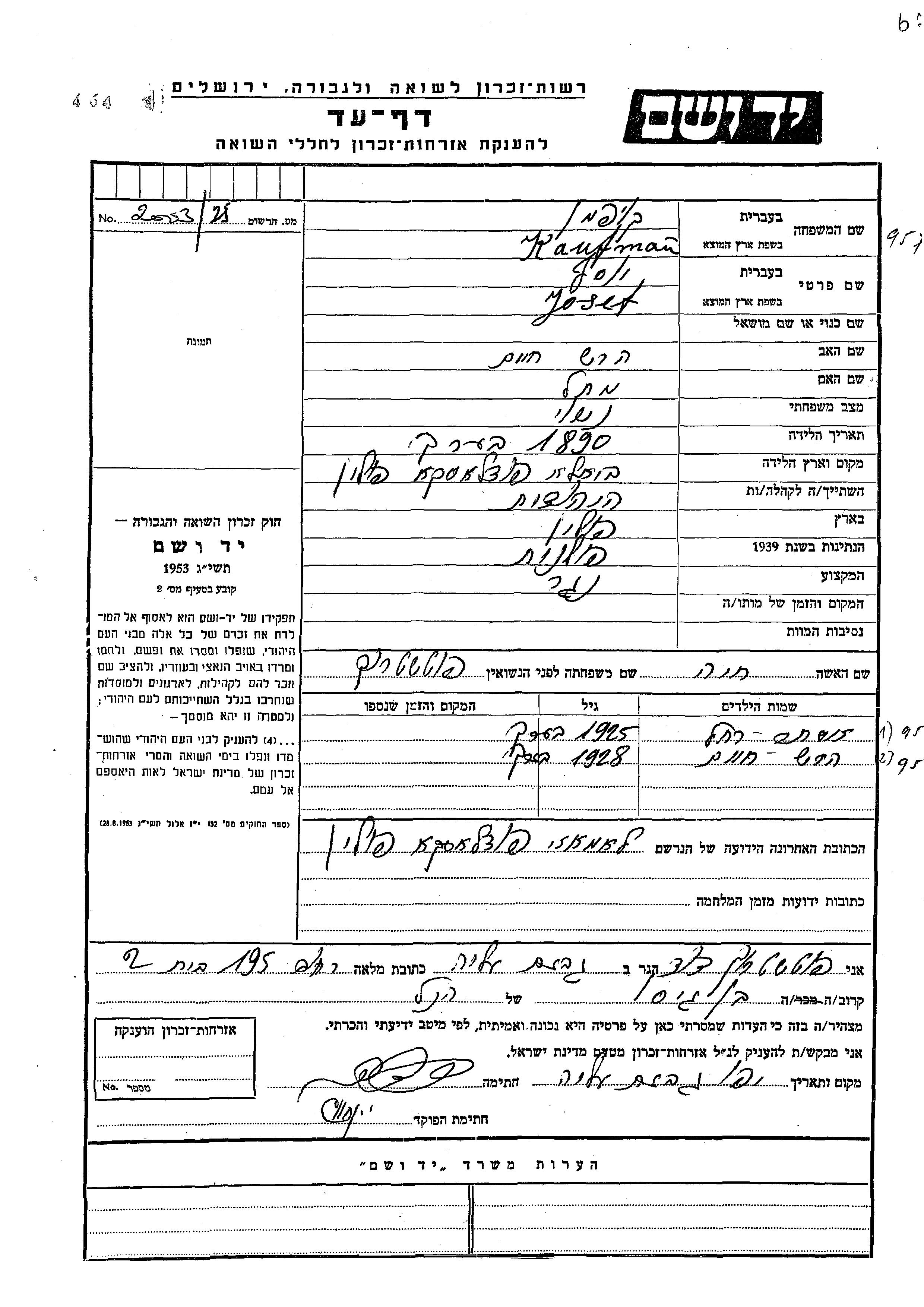 Kaufman Ester Rakhel 1925 Lomazy, Polen Gedenkblatt