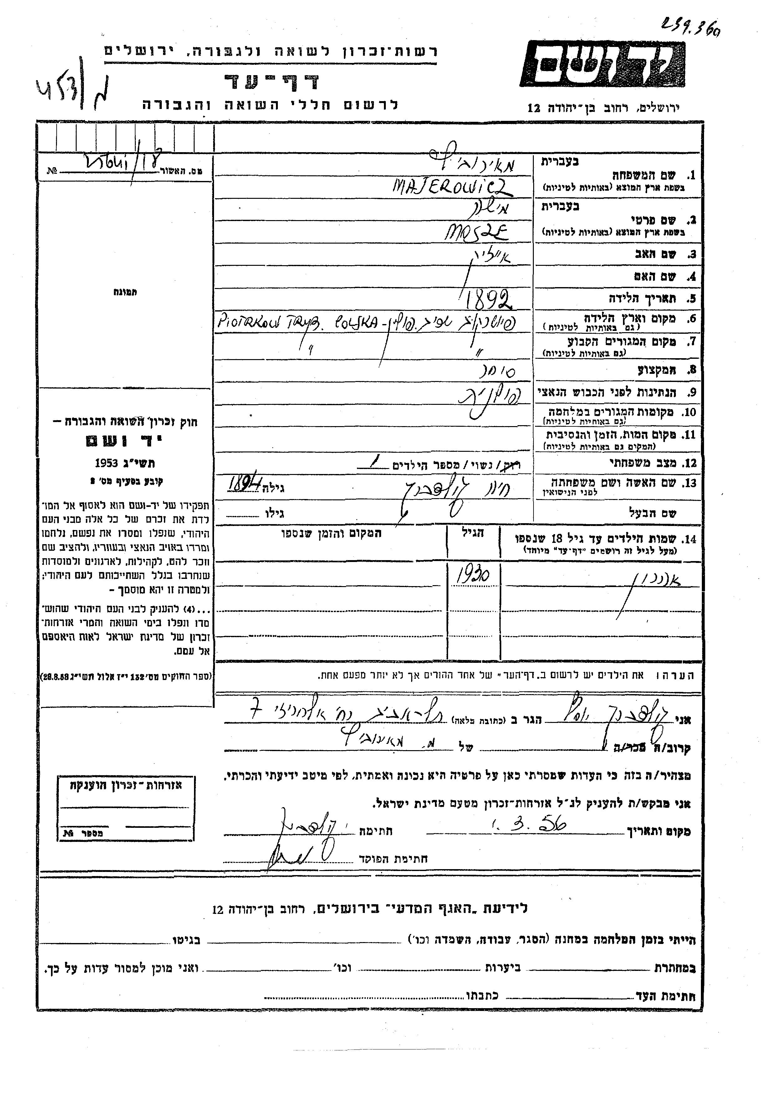 Aharon Majerowicz wurde Er war der Sohn von Mosze Misha und Khaia, geb. Goldberg. Er war Kind. Vor dem Zweiten Weltkrieg lebte er in Piotrkow Trybunalski, Polen. Während des Krieges war er in Piotrkow Trybunalski, Polen.